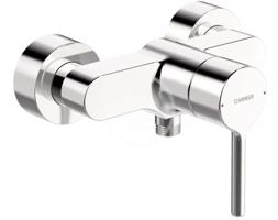 Páková sprchová baterie provedení: chrom materiál: mosaz rozteč baterie: 150 mm průtok při 0,3 MPa: 15,6 l/min keramická kartuše Ø 40 mm pro ovládání teploty a průtoku vody funkce pro nastavení maximální teploty a průtoku vody připojení: etážky, krycí desky zabezpečení proti zpětnému toku včetně nastavitelného omezovače teploty vody sprchové příslušenství není součástí dodávky