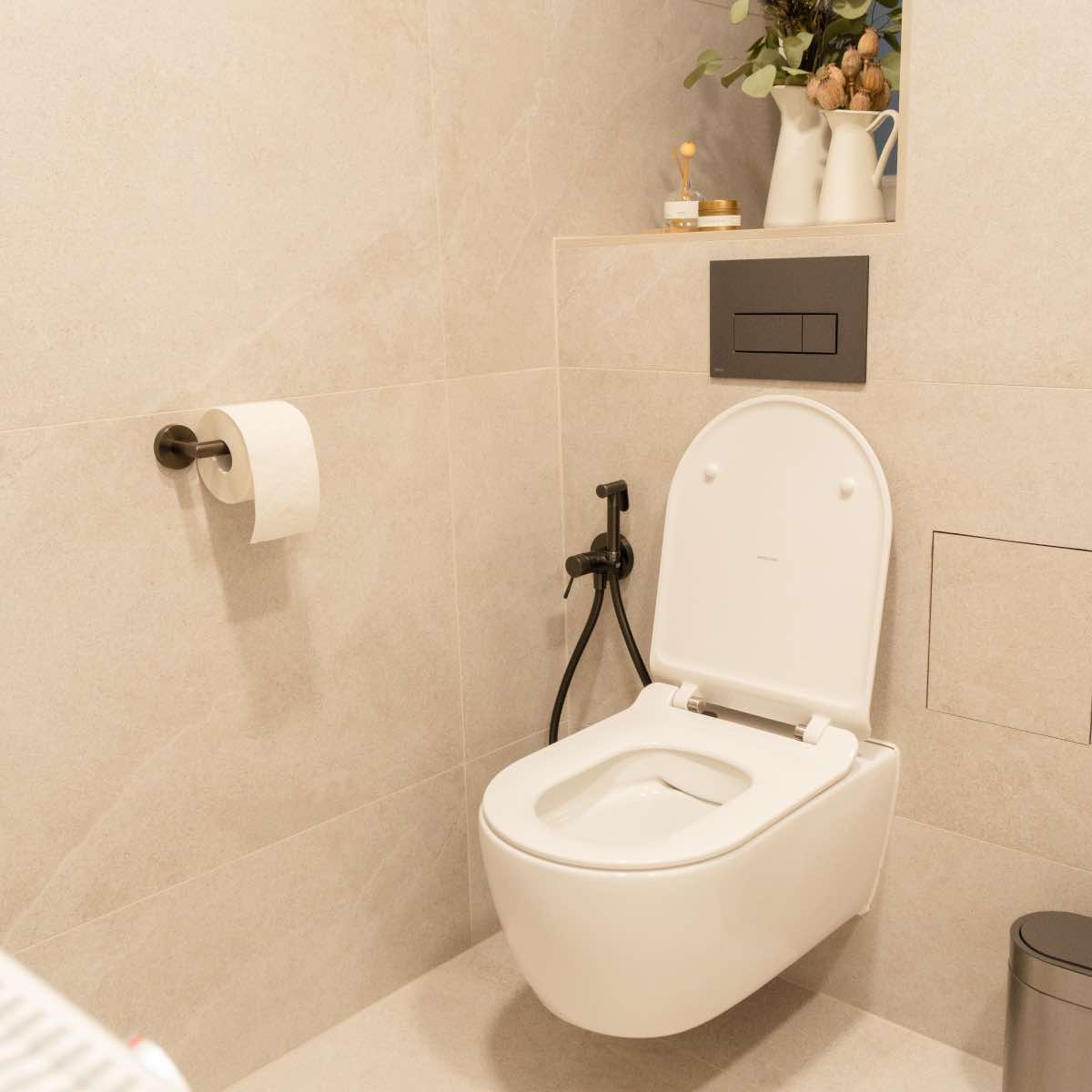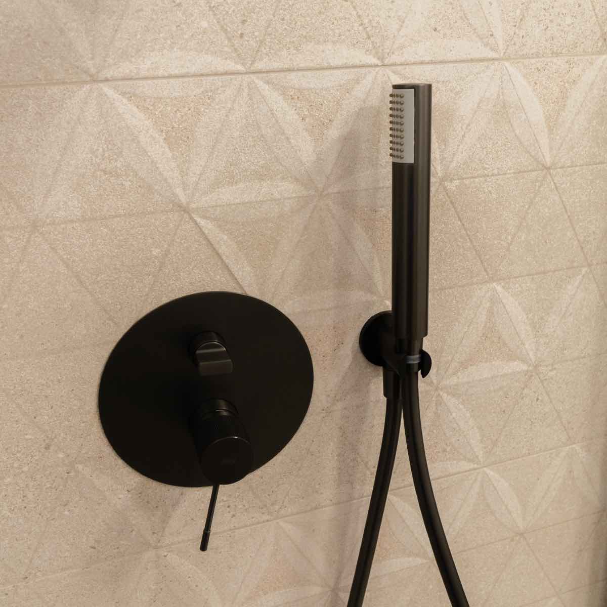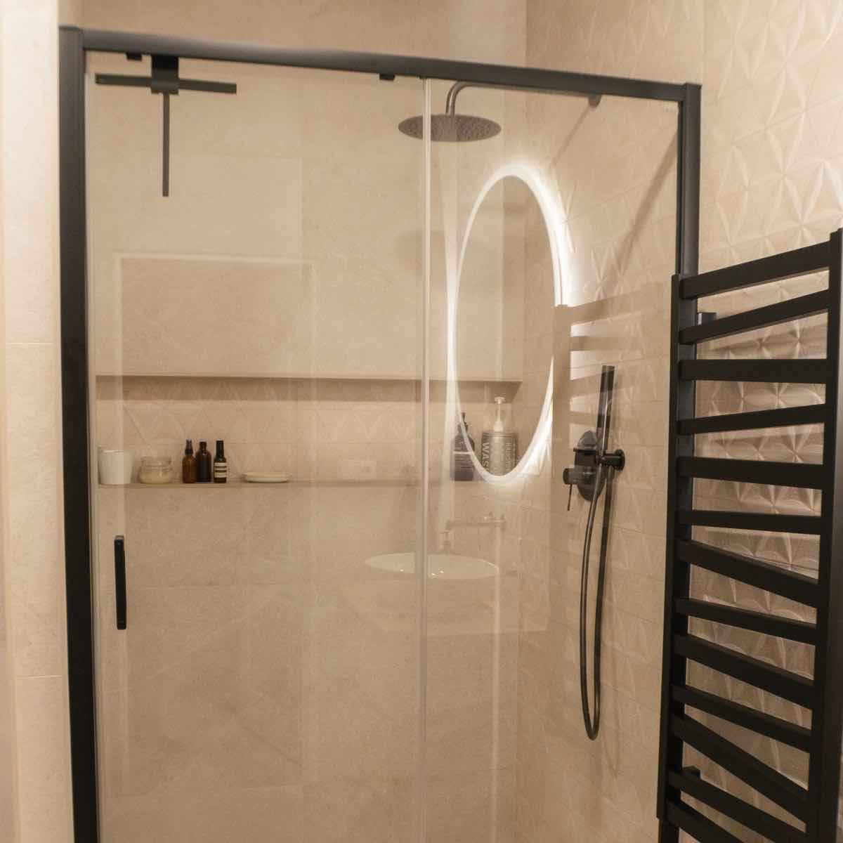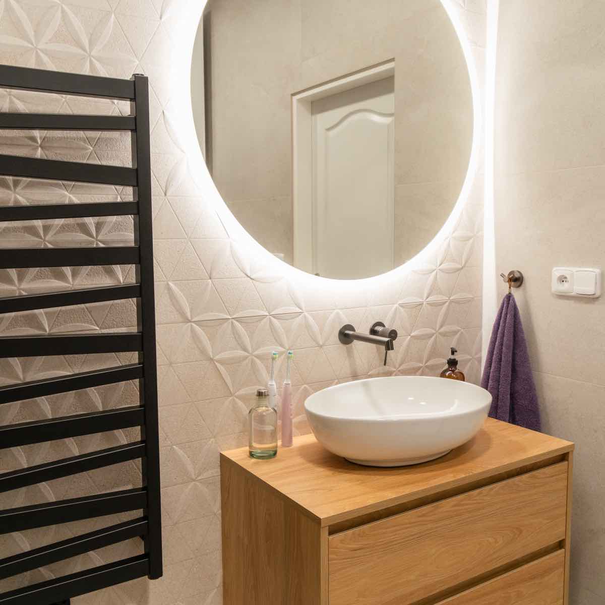 Tato moderní koupelna vyniká elegantním designem s jemnými geometrickými obklady a černými detaily. Kulaté zrcadlo s LED podsvícením a dřevěná skříňka s umyvadlem dodávají prostoru nadčasový charakter. Praktické černé topení a sprchový kout s čirým sklem podtrhují vzdušnost a stylovou funkčnost celého interiéru.