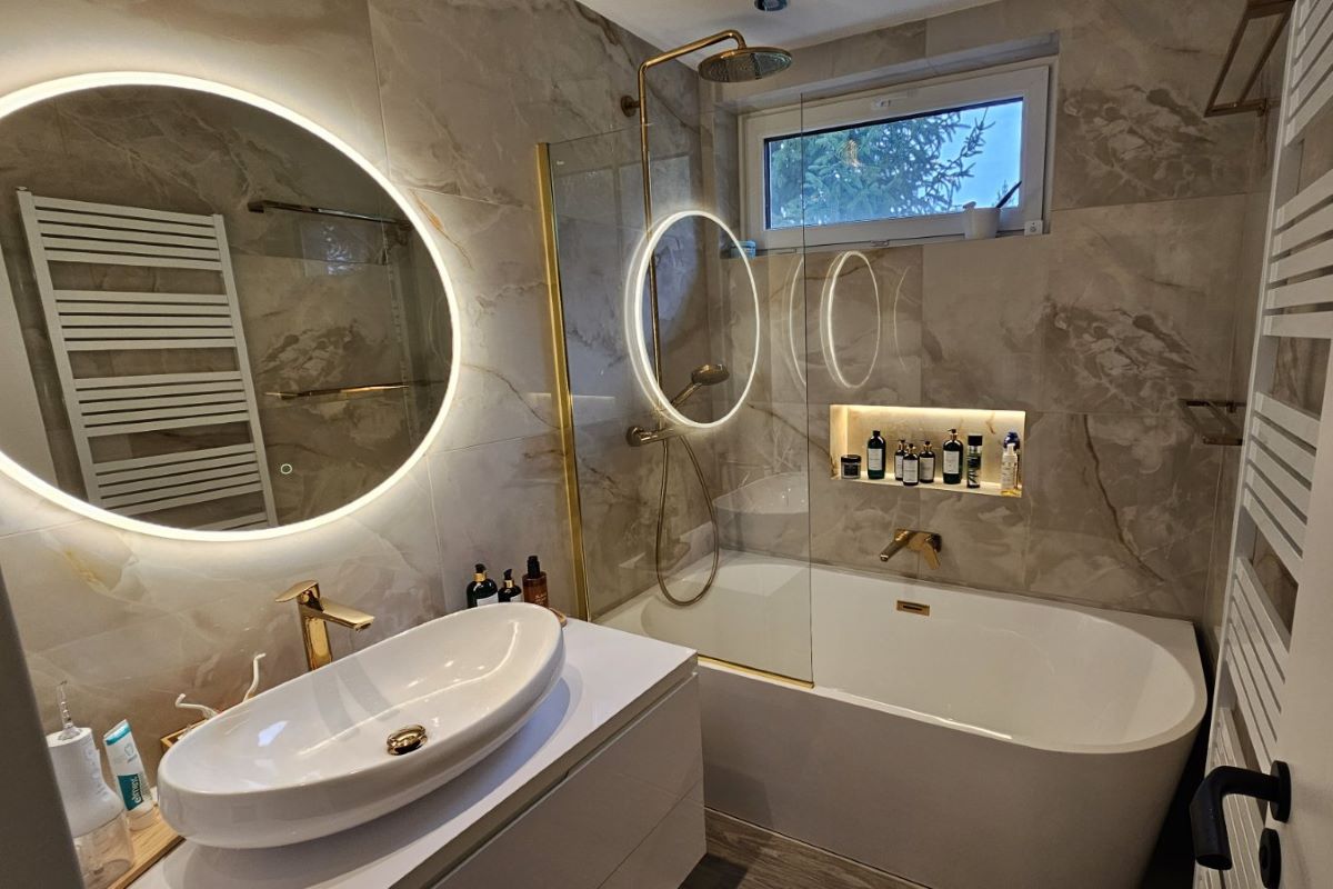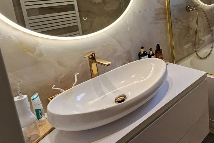 Bylo fajn nakupovat u Vás a ne jinde. Všichni s novostavbami kolem nás mají úplně klasické nudné koupelny a my v bytovce máme takovýhle luxus. Prostě pecka! Zlaté baterie jsou horší na údržbu, ale opět bychom neměnili, protože ta zlatá působí krásně teple.Klient Igor