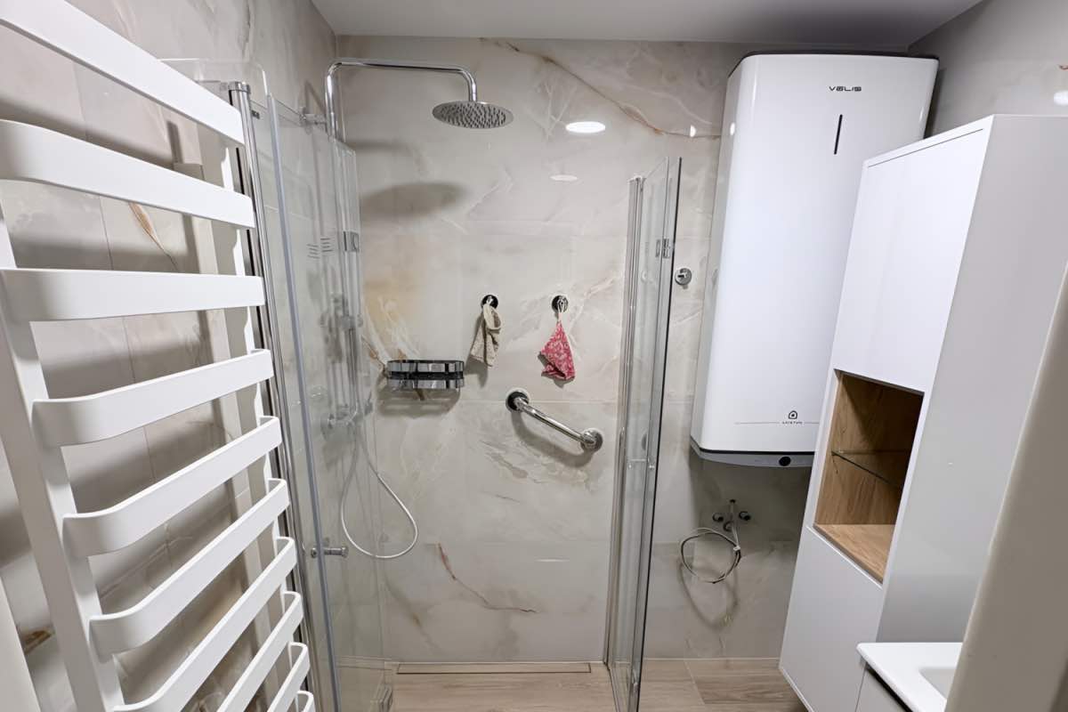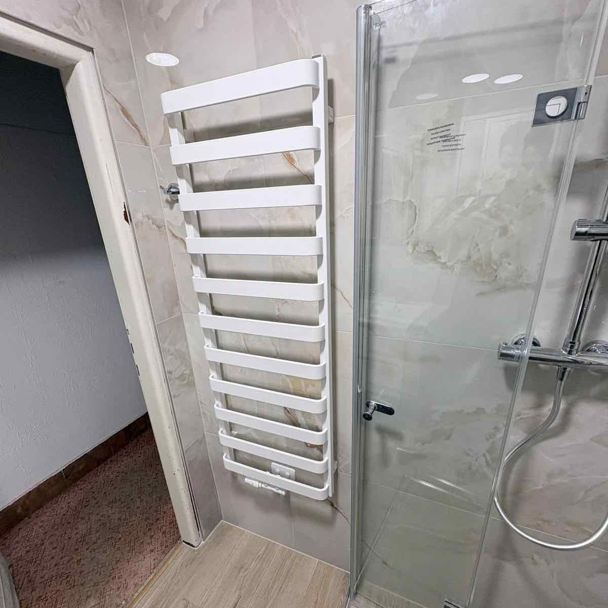Stylový bílý žebříkový radiátor plní v koupelně dvojí funkci – estetickou i praktickou. Slouží nejen k vyhřívání prostoru, ale také jako sušák na ručníky. Jeho čisté linie ladí s celkovým světlým pojetím koupelny a díky umístění u sprchového koutu je vždy po ruce tam, kde je nejvíce potřeba.