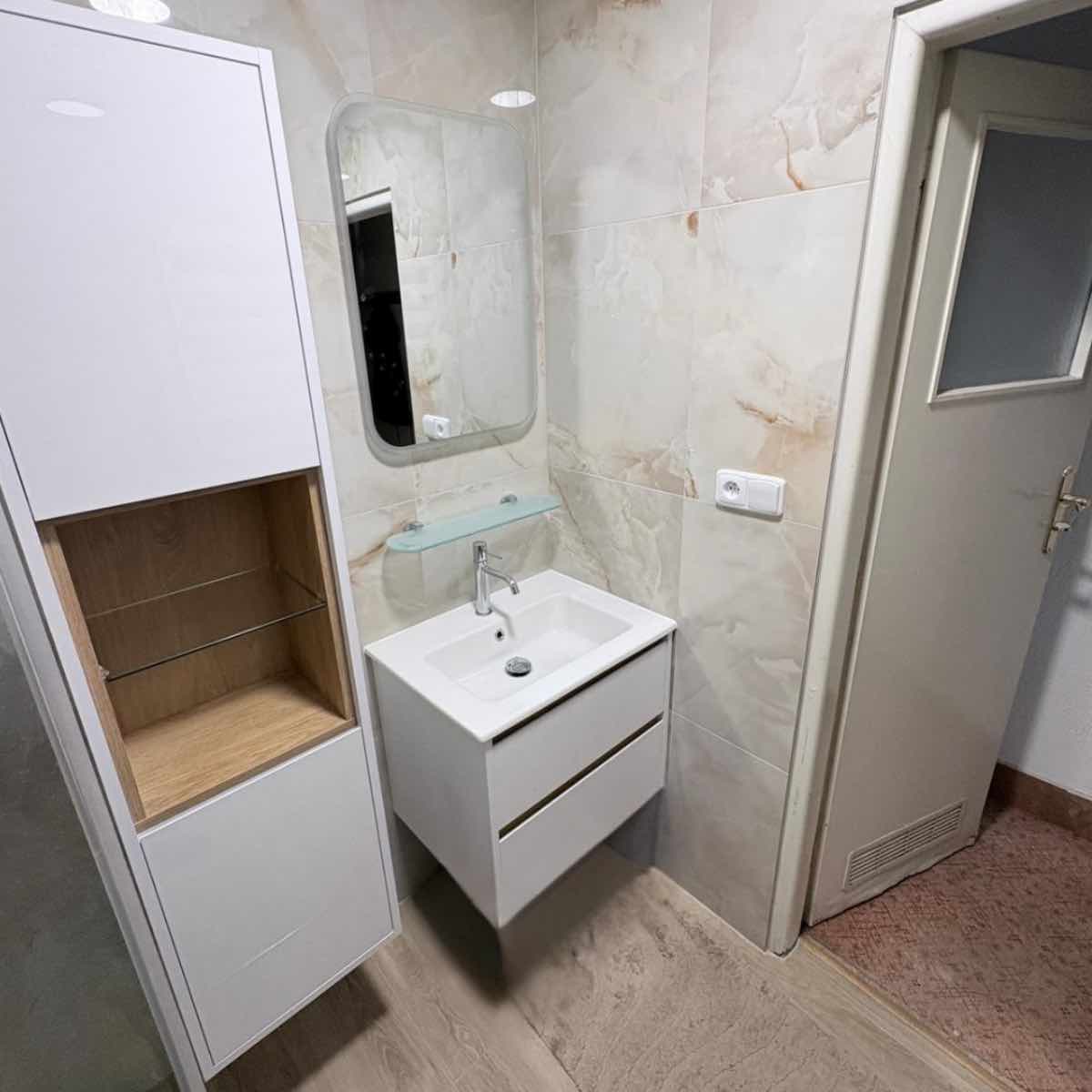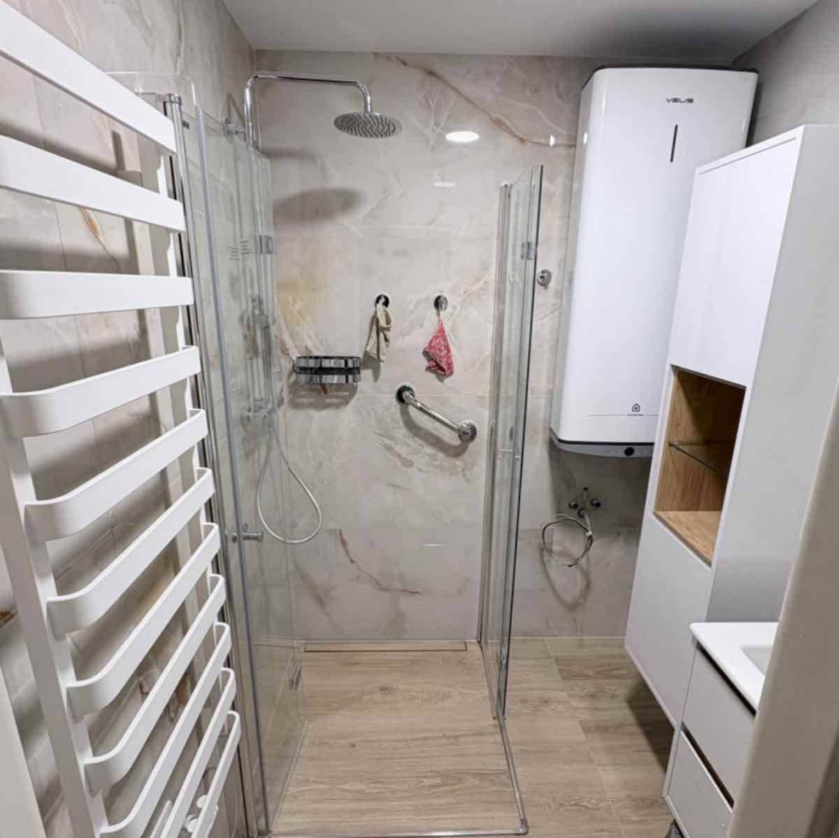 Dominantou této koupelny je praktický bezbariérový sprchový kout se skleněnými dveřmi a madlem, které zajišťuje bezpečnost při vstupu i sprchování. Stěnu doplňují decentní světlé obklady s jemným mramorovým vzorem, které celému prostoru dodávají lehkost a eleganci.