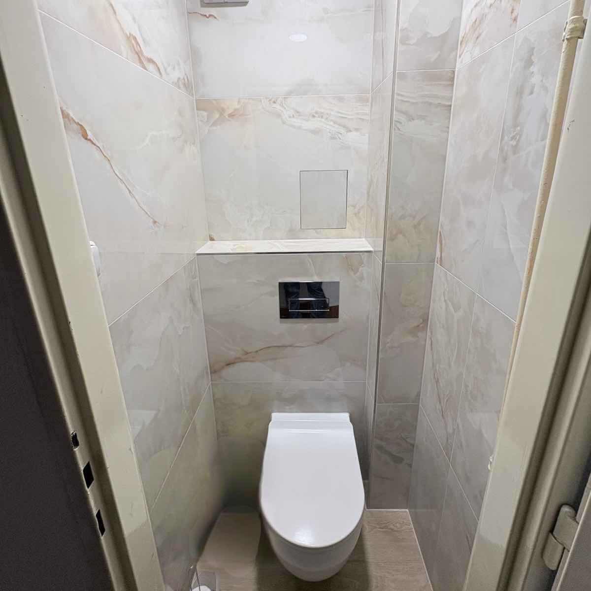 Závěsné WC je zasazeno do výklenku obloženého elegantními dlaždicemi s jemným mramorovým vzorem, které prostoru dodávají luxusní, ale zároveň klidný vzhled. Horní římsa slouží jako praktická odkládací plocha a decentní tlačítko splachování v chromovém provedení stylově doplňuje čistý design celého prostoru.