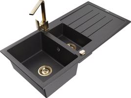 Technická data: Dřez: Rozměr: 1000x500x200 mm Hloubka komory: 190 mm (větší), 115 mm (menší) Rozměry komory: 430x330 mm (větší), 340x170 mm (menší) Průměr odtoku: ø90 mm Typ: 1,5-miska s odkapávačem Typ: Zapuštěné do pracovní desky Barva: Skvrnitá černá Povrchová úprava sifonu: Chrome Materiál: žula (80% žulové kamenivo 20% pryskyřice) Přepadový otvor: Ano Otvory: (baterie, automat) 2 Instalace: Univerzální, lze instalovat s odkapávačem na levou nebo pravou stranu Vysoká odolnost proti poškrábání a změně barvy Odolnost proti tepelným šokům Povrch pro snadné čištění Dva dodatečné vyfrézované otvory pro samoděrování ø35 Kuchyňská baterie: Materiál: mosaz Černá barva Hlava: Keramická Perlátor: Ano Typ: Jednopákové Výška baterie: 290 mm Rozsah výtoku: 220 mm EAN: 5905315020970