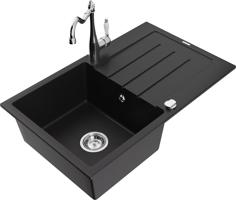 Technická data: dřez: Rozměr: 795 x 495 x 200 mm Hloubka komory: 200 mm Rozměry komory: 440x360 mm Průměr odtoku: ø90 mm Typ: 1-miska s odkapávačem Typ: Zapuštěné do pracovní desky Černá barva Povrchová úprava sifonu: Chrome Materiál: žula (80 % žulové kamenivo, 20 % pryskyřice) Přepadový otvor: Ano Otvory: (baterie, automatické) 2 Instalace: Univerzální, lze instalovat s odkapávačem na levou nebo pravou stranu Vysoká odolnost proti poškrábání a změně barvy Odolnost proti tepelným šokům Snadno čistitelný povrch Dva dodatečné vyfrézované otvory pro samoděrování ø35 kuchyňská baterie: Materiál: mosaz Barva: Chrome Hlava: Keramická Provzdušňovač: Ano Typ: Jedna páka Výška baterie: 290 mm Rozsah výtoku: 260 mm EAN: 5905315040855