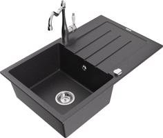 Technická data: dřez: Rozměr: 795 x 495 x 200 mm Hloubka komory: 200 mm Rozměry komory: 440x360 mm Průměr odtoku: ø90 mm Typ: 1-miska s odkapávačem Typ: Zapuštěné do pracovní desky Barva: Skvrnitá černá Povrchová úprava sifonu: Chrome Materiál: žula (80 % žulové kamenivo, 20 % pryskyřice) Přepadový otvor: Ano Otvory: (baterie, automatické) 2 Instalace: Univerzální, lze instalovat s odkapávačem na levou nebo pravou stranu Vysoká odolnost proti poškrábání a změně barvy Odolnost proti tepelným šokům Snadno čistitelný povrch Dva dodatečné vyfrézované otvory pro samoděrování ø35 kuchyňská baterie: Materiál: mosaz Černá barva Hlava: Keramická Provzdušňovač: Ano Typ: Jedna páka Výška baterie: 290 mm Rozsah výtoku: 260 mm EAN: 5905315040824