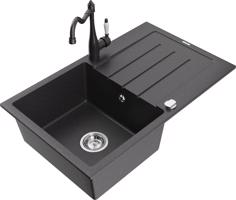 Technická data: dřez: Rozměr: 795 x 495 x 200 mm Hloubka komory: 200 mm Rozměry komory: 440x360 mm Průměr odtoku: ø90 mm Typ: 1-miska s odkapávačem Typ: Zapuštěné do pracovní desky Barva: Skvrnitá černá Povrchová úprava sifonu: Chrome Materiál: žula (80 % žulové kamenivo, 20 % pryskyřice) Přepadový otvor: Ano Otvory: (baterie, automatické) 2 Instalace: Univerzální, lze instalovat s odkapávačem na levou nebo pravou stranu Vysoká odolnost proti poškrábání a změně barvy Odolnost proti tepelným šokům Snadno čistitelný povrch Dva dodatečné vyfrézované otvory pro samoděrování ø35 kuchyňská baterie: Materiál: mosaz Barva: Skvrnitá černá Hlava: Keramická Provzdušňovač: Ano Typ: Jedna páka Výška baterie: 290 mm Rozsah výtoku: 260 mm EAN: 5905315040848
