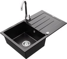 Technická data: dřez: Rozměr: 795 x 495 x 200 mm Hloubka komory: 200 mm Rozměry komory: 440x360 mm Průměr odtoku: ø90 mm Typ: 1-miska s odkapávačem Typ: Zapuštěné do pracovní desky Černá barva Povrchová úprava sifonu: Chrome Materiál: žula (80 % žulové kamenivo, 20 % pryskyřice) Přepadový otvor: Ano Otvory: (baterie, automatické) 2 Instalace: Univerzální, lze instalovat s odkapávačem na levou nebo pravou stranu Vysoká odolnost proti poškrábání a změně barvy Odolnost proti tepelným šokům Snadno čistitelný povrch Dva dodatečné vyfrézované otvory pro samoděrování ø35 kuchyňská baterie: Materiál: mosaz Barva: Chrome Hlava: Keramická Provzdušňovač: Ano Výška baterie: 335 mm Rozsah výtoku: 180 mm EAN: 5907709160736