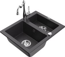 Technická data: dřez: Rozměr: 582 x 475 x 177 mm Hloubka komory: 162 mm (větší), 102 mm (menší) Rozměry komory: 395x272 mm (větší), 375x182 mm (menší) Průměr odtoku: ø90 mm Typ: 1,5 komory Typ: Zapuštěné do pracovní desky Barva: Skvrnitá černá Povrchová úprava sifonu: Chrome Materiál: žula (80 % žulové kamenivo, 20 % pryskyřice) Přepadový otvor: Ano Otvory: (baterie, automatické) 2 Vysoká odolnost proti poškrábání a změně barvy Odolnost proti tepelným šokům Snadno čistitelný povrch Jeden dodatečný vyfrézovaný otvor pro samoděrování ø35 kuchyňská baterie: Materiál: mosaz Barva: Chrome Hlava: Keramická Provzdušňovač: Ano Typ: Jedna páka Výška baterie: 290 mm Rozsah výtoku: 260 mm EAN: 5905315042415