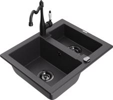 Technická data: dřez: Rozměr: 582 x 475 x 177 mm Hloubka komory: 162 mm (větší), 102 mm (menší) Rozměry komory: 395x272 mm (větší), 375x182 mm (menší) Průměr odtoku: ø90 mm Typ: 1,5 komory Typ: Zapuštěné do pracovní desky Barva: Skvrnitá černá Povrchová úprava sifonu: černá Materiál: žula (80 % žulové kamenivo, 20 % pryskyřice) Přepadový otvor: Ano Otvory: (baterie, automatické) 2 Vysoká odolnost proti poškrábání a změně barvy Odolnost proti tepelným šokům Snadno čistitelný povrch Jeden dodatečný vyfrézovaný otvor pro samoděrování ø35 kuchyňská baterie: Materiál: mosaz Černá barva Hlava: Keramická Provzdušňovač: Ano Typ: Jedna páka Výška baterie: 290 mm Rozsah výtoku: 260 mm EAN: 5905315042446