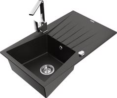 Technická data: dřez: Rozměr: 775x470x200mm Hloubka komory: 180 mm Rozměry komory: 410x355 mm Průměr odtoku: ø90 mm Typ: 1-miska s odkapávačem Typ: Zapuštěné do pracovní desky Barva: černá/zlatá metalíza Povrchová úprava sifonu: Chrome Materiál: žula (80 % žulové kamenivo, 20 % pryskyřice) Přepadový otvor: Ano Otvory: (baterie, automatické) 2 Instalace: Univerzální, lze instalovat s odkapávačem na levou nebo pravou stranu Vysoká odolnost proti poškrábání a změně barvy Odolnost proti tepelným šokům Snadno čistitelný povrch kuchyňská baterie: Materiál: mosaz Barva: Chrome Hlava: Keramická Provzdušňovač: Ano Typ: Jedna páka Výška baterie: 290 mm Rozsah výtoku: 220 mm EAN: 5905315020581