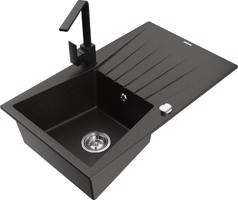 Technická data: dřez: Rozměr: 775x470x200mm Hloubka komory: 180 mm Rozměry komory: 410x355 mm Průměr odtoku: ø90 mm Typ: 1-miska s odkapávačem Typ: Zapuštěné do pracovní desky Barva: černá/zlatá metalíza Povrchová úprava sifonu: Chrome Materiál: žula (80 % žulové kamenivo, 20 % pryskyřice) Přepadový otvor: Ano Otvory: (baterie, automatické) 2 Instalace: Univerzální, lze instalovat s odkapávačem na levou nebo pravou stranu Vysoká odolnost proti poškrábání a změně barvy Odolnost proti tepelným šokům Snadno čistitelný povrch kuchyňská baterie: Materiál: mosaz Černá barva Hlava: Keramická Provzdušňovač: Ano Typ: Jedna páka Výška baterie: 290 mm Rozsah výtoku: 220 mm EAN: 5905315020628