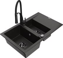 Technická data: dřez: Rozměr: 737x475x177mm Hloubka komory: 167 mm (větší), 107 mm (menší) Rozměry komory: 395x272 mm (větší), (menší) 375x182 mm Průměr odtoku: ø90 mm Typ: 1,5-komorový s krátkým odkapávačem Typ: Zapuštěné do pracovní desky Barva: černá/zlatá metalíza Povrchová úprava sifonu: černá Materiál: žula (80 % žulové kamenivo, 20 % pryskyřice) Přepadový otvor: Ano Otvory: (baterie, automatické) 2 Instalace: Univerzální, lze instalovat s odkapávačem na levou nebo pravou stranu Vysoká odolnost proti poškrábání a změně barvy Odolnost proti tepelným šokům Snadno čistitelný povrch kuchyňská baterie: Materiál: mosaz Černá barva Hlava: Keramická Provzdušňovač: Ano Typ: Jedna páka Výška baterie: 430 mm Rozsah výtoku: 185 mm Baterie má výsuvný výtok EAN: 5905315045324