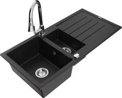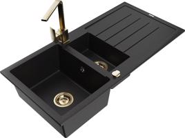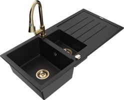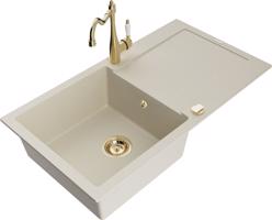 Technická data: dřez: Rozměr: 900x500x190mm Hloubka komory: 180 mm Rozměry komory: 430x415 mm Průměr odtoku: ø90 mm Typ: 1-miska s odkapávačem Typ: Zapuštěné do pracovní desky Barva béžová Povrchová úprava sifonu: zlatá Materiál: žula (80 % žulové kamenivo, 20 % pryskyřice) Přepadový otvor: Ano Otvory: (baterie, automatické) 2 Instalace: Univerzální, lze instalovat s odkapávačem na levou nebo pravou stranu Vysoká odolnost proti poškrábání a změně barvy Odolnost proti tepelným šokům Snadno čistitelný povrch Dva dodatečné vyfrézované otvory pro samoděrování ø35 kuchyňská baterie: Materiál: mosaz Barva: Zlatá Hlava: Keramická Provzdušňovač: Ano Typ: Jedna páka Výška baterie: 290 mm Rozsah výtoku: 260 mm EAN: 5905315037442
