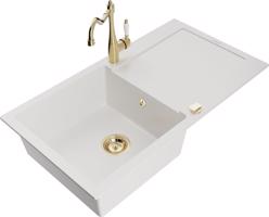 Technická data: dřez: Rozměr: 900x500x190mm Hloubka komory: 180 mm Rozměry komory: 430x415 mm Průměr odtoku: ø90 mm Typ: 1-miska s odkapávačem Typ: Zapuštěné do pracovní desky bílá barva Povrchová úprava sifonu: zlatá Materiál: žula (80 % žulové kamenivo, 20 % pryskyřice) Přepadový otvor: Ano Otvory: (baterie, automatické) 2 Instalace: Univerzální, lze instalovat s odkapávačem na levou nebo pravou stranu Vysoká odolnost proti poškrábání a změně barvy Odolnost proti tepelným šokům Snadno čistitelný povrch Dva dodatečné vyfrézované otvory pro samoděrování ø35 kuchyňská baterie: Materiál: mosaz Barva: Zlatá Hlava: Keramická Provzdušňovač: Ano Typ: Jedna páka Výška baterie: 290 mm Rozsah výtoku: 260 mm EAN: 5905315037404