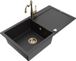 Technická data: dřez: Rozměr: 900x500x190mm Hloubka komory: 180 mm Rozměry komory: 430x415 mm Průměr odtoku: ø90 mm Typ: 1-miska s odkapávačem Typ: Zapuštěné do pracovní desky Barva: černá/stříbrná metalíza Povrchová úprava sifonu: zlatá Materiál: žula (80 % žulové kamenivo, 20 % pryskyřice) Přepadový otvor: Ano Otvory: (baterie, automatické) 2 Instalace: Univerzální, lze instalovat s odkapávačem na levou nebo pravou stranu Vysoká odolnost proti poškrábání a změně barvy Odolnost proti tepelným šokům Snadno čistitelný povrch Dva dodatečné vyfrézované otvory pro samoděrování ø35 kuchyňská baterie: Materiál: mosaz Barva: Zlatá Hlava: Keramická Provzdušňovač: Ano Typ: Jedna páka Výška baterie: 290 mm Rozsah výtoku: 260 mm EAN: 5905315037527