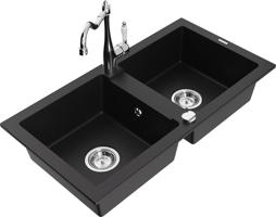 Technická data: dřez: Rozměr: 820 x 436 x 161 mm Hloubka komory: 151 mm Rozměry komory: 356x336 mm Průměr odtoku: ø90 mm Typ: 2-komorový Typ: Zapuštěné do pracovní desky Černá barva Povrchová úprava sifonu: Chrome Materiál: žula (80 % žulové kamenivo, 20 % pryskyřice) Přepadový otvor: Ano Otvory: (baterie, automatické) 2 Vysoká odolnost proti poškrábání a změně barvy Odolnost proti tepelným šokům Snadno čistitelný povrch kuchyňská baterie: Materiál: mosaz Barva: Chrome Hlava: Keramická Provzdušňovač: Ano Typ: Jedna páka Výška baterie: 290 mm Rozsah výtoku: 260 mm EAN: 5905315038616