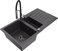 Technická data: dřez: Rozměr: 900x505x200mm Hloubka komory: 180 mm (větší), 115 mm (menší) Rozměry komory: 435x335 mm (větší), 345x150 mm (menší) Průměr odtoku: ø90 mm Typ: 1,5-komorový s krátkým odkapávačem Typ: Zapuštěné do pracovní desky Barva: Skvrnitá černá Povrchová úprava sifonu: černá Materiál: žula (80 % žulové kamenivo, 20 % pryskyřice) Přepadový otvor: Ano Otvory: (baterie, automatické) 2 Instalace: Univerzální, lze instalovat s odkapávačem na levou nebo pravou stranu Vysoká odolnost proti poškrábání a změně barvy Odolnost proti tepelným šokům Snadno čistitelný povrch Dva dodatečné vyfrézované otvory pro samoděrování ø35 kuchyňská baterie: Materiál: mosaz Barva: chrom/černá Hlava: Keramická Provzdušňovač: Ano Typ: Jedna páka Výška baterie: 430 mm Rozsah výtoku: 185 mm Baterie má výsuvný výtok EAN: 5905315043252