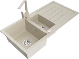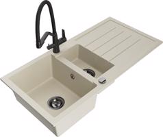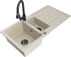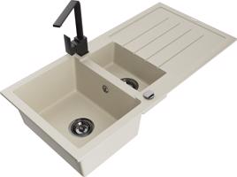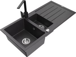 Technická data: dřez: Rozměr: 900x505x200mm Hloubka komory: 180 mm (větší), 115 mm (menší) Rozměry komory: 435x335 mm (větší), 345x150 mm (menší) Průměr odtoku: ø90 mm Typ: 1,5-komorový s krátkým odkapávačem Typ: Zapuštěné do pracovní desky Šedá barva Povrchová úprava sifonu: Chrome Materiál: žula (80 % žulové kamenivo, 20 % pryskyřice) Přepadový otvor: Ano Otvory: (baterie, automatické) 2 Instalace: Univerzální, lze instalovat s odkapávačem na levou nebo pravou stranu Vysoká odolnost proti poškrábání a změně barvy Odolnost proti tepelným šokům Snadno čistitelný povrch Dva dodatečné vyfrézované otvory pro samoděrování ø35 kuchyňská baterie: Materiál: mosaz Barva: Chrome Hlava: Keramická Provzdušňovač: Ano Typ: Jedna páka Výška baterie: 290 mm Rozsah výtoku: 260 mm EAN: 5905315037787