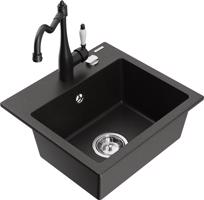 Technická data: dřez: Rozměr: 435x410x171mm Hloubka komory: 161 mm Rozměry komory: 375x280 mm Průměr odtoku: ø90 mm Typ: 1-komorový Typ: Zapuštěné do pracovní desky Barva: černá/zlatá metalíza Povrchová úprava sifonu: Chrome Materiál: žula (80 % žulové kamenivo, 20 % pryskyřice) Přepadový otvor: Ano Otvory: (baterie, automatické) 2 Vysoká odolnost proti poškrábání a změně barvy Odolnost proti tepelným šokům Snadno čistitelný povrch Jeden dodatečný vyfrézovaný otvor pro samoděrování ø35 kuchyňská baterie: Materiál: mosaz Černá barva Hlava: Keramická Provzdušňovač: Ano Typ: Jedna páka Výška baterie: 290 mm Rozsah výtoku: 260 mm EAN: 5905315038876