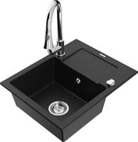 Technická data: dřez: Rozměr: 435x410x171mm Hloubka komory: 161 mm Rozměry komory: 375x280 mm Průměr odtoku: ø90 mm Typ: 1-komorový Typ: Zapuštěné do pracovní desky Šedá barva Povrchová úprava sifonu: Chrome Materiál: žula (80 % žulové kamenivo, 20 % pryskyřice) Přepadový otvor: Ano Otvory: (baterie, automatické) 2 Vysoká odolnost proti poškrábání a změně barvy Odolnost proti tepelným šokům Snadno čistitelný povrch Jeden dodatečný vyfrézovaný otvor pro samoděrování ø35 kuchyňská baterie: Materiál: mosaz Barva: Chrome Hlava: Keramická Provzdušňovač: Ano Typ: Jedna páka Výška baterie: 290 mm Rozsah výtoku: 260 mm EAN: 5905315038746