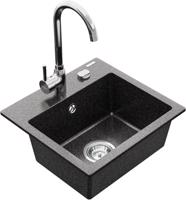 Technická data: dřez: Rozměr: 435x410x171mm Hloubka komory: 161 mm Rozměry komory: 375x280 mm Průměr odtoku: ø90 mm Typ: 1-komorový Typ: Zapuštěné do pracovní desky Barva: Skvrnitá černá Povrchová úprava sifonu: Chrome Materiál: žula (80 % žulové kamenivo, 20 % pryskyřice) Přepadový otvor: Ano Otvory: (baterie, automatické) 2 Vysoká odolnost proti poškrábání a změně barvy Odolnost proti tepelným šokům Snadno čistitelný povrch Jeden dodatečný vyfrézovaný otvor pro samoděrování ø35 kuchyňská baterie: Materiál: mosaz Barva: Chrome Hlava: Keramická Provzdušňovač: Ano Výška baterie: 335 mm Rozsah výtoku: 180 mm EAN: 5907709189652