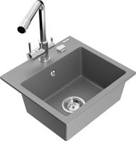 Technická data: dřez: Rozměr: 435x410x171mm Hloubka komory: 161 mm Rozměry komory: 375x280 mm Průměr odtoku: ø90 mm Typ: 1-komorový Typ: Zapuštěné do pracovní desky Šedá barva Povrchová úprava sifonu: Chrome Materiál: žula (80 % žulové kamenivo, 20 % pryskyřice) Přepadový otvor: Ano Otvory: (baterie, automatické) 2 Vysoká odolnost proti poškrábání a změně barvy Odolnost proti tepelným šokům Snadno čistitelný povrch Jeden dodatečný vyfrézovaný otvor pro samoděrování ø35 kuchyňská baterie: Materiál: mosaz Barva: Chrome Hlava: Keramická Provzdušňovač: Ano Typ: Dvě rukojeti Rozsah výtoku: 235 mm Výška baterie: 315 mm Dvouhlavá baterie s přídavným kanálem pro filtrovanou pitnou vodu EAN: 5905315023377