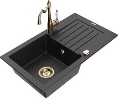 Technická data: dřez: Rozměr: 752 x 436 x 161 mm Hloubka komory: 151 mm Rozměry komory: 356x332 mm Průměr odtoku: ø90 mm Typ: 1-miska s odkapávačem Typ: Zapuštěné do pracovní desky Barva: černá/stříbrná metalíza Povrchová úprava sifonu: Chrome Materiál: žula (80 % žulové kamenivo, 20 % pryskyřice) Přepadový otvor: Ano Otvory: (baterie, automatické) 2 Instalace: Univerzální, lze instalovat s odkapávačem na levou nebo pravou stranu Vysoká odolnost proti poškrábání a změně barvy Odolnost proti tepelným šokům Snadno čistitelný povrch Dva dodatečné vyfrézované otvory pro samoděrování ø35 kuchyňská baterie: Materiál: mosaz Černá barva Hlava: Keramická Provzdušňovač: Ano Typ: Jedna páka Výška baterie: 290 mm Rozsah výtoku: 260 mm EAN: 5905315039774