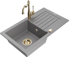 Technická data: dřez: Rozměr: 752 x 436 x 161 mm Hloubka komory: 151 mm Rozměry komory: 356x332 mm Průměr odtoku: ø90 mm Typ: 1-miska s odkapávačem Typ: Zapuštěné do pracovní desky Šedá barva Povrchová úprava sifonu: zlatá Materiál: žula (80 % žulové kamenivo, 20 % pryskyřice) Přepadový otvor: Ano Otvory: (baterie, automatické) 2 Instalace: Univerzální, lze instalovat s odkapávačem na levou nebo pravou stranu Vysoká odolnost proti poškrábání a změně barvy Odolnost proti tepelným šokům Snadno čistitelný povrch Dva dodatečné vyfrézované otvory pro samoděrování ø35 kuchyňská baterie: Materiál: mosaz Barva: Zlatá Hlava: Keramická Provzdušňovač: Ano Typ: Jedna páka Výška baterie: 290 mm Rozsah výtoku: 260 mm EAN: 5905315039712