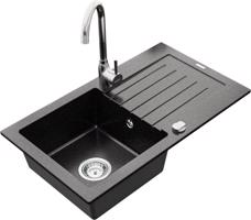 Technická data: dřez: Rozměr: 752 x 436 x 161 mm Hloubka komory: 151 mm Rozměry komory: 356x332 mm Průměr odtoku: ø90 mm Typ: 1-miska s odkapávačem Typ: Zapuštěné do pracovní desky Barva: černá/stříbrná metalíza Povrchová úprava sifonu: Chrome Materiál: žula (80 % žulové kamenivo, 20 % pryskyřice) Přepadový otvor: Ano Otvory: (baterie, automatické) 2 Instalace: Univerzální, lze instalovat s odkapávačem na levou nebo pravou stranu Vysoká odolnost proti poškrábání a změně barvy Odolnost proti tepelným šokům Snadno čistitelný povrch Dva dodatečné vyfrézované otvory pro samoděrování ø35 kuchyňská baterie: Materiál: mosaz Barva: Chrome Hlava: Keramická Provzdušňovač: Ano Výška baterie: 335 mm Rozsah výtoku: 180 mm EAN: 5907709160217