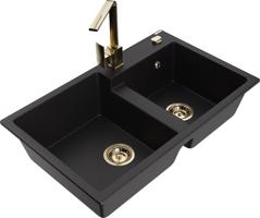 Technická data: dřez: Rozměr: 800 x 500 x 190 mm Hloubka komory: 180 mm (větší), 180 mm (menší) Rozměry komory: 440x387 mm (větší), 370x303 mm (menší) Průměr odtoku: ø90 mm Typ: 2-komorový Typ: Zapuštěné do pracovní desky Materiál: žula Černá barva Povrchová úprava sifonu: Chrome Materiál: žula (80 % žulové kamenivo, 20 % pryskyřice) Přepadový otvor: Ano Otvory: (baterie, automatické) 2 Vysoká odolnost proti poškrábání a změně barvy Odolnost proti tepelným šokům Snadno čistitelný povrch Jeden dodatečný vyfrézovaný otvor pro samoděrování ø35 kuchyňská baterie: Materiál: mosaz Černá barva Hlava: Keramická Provzdušňovač: Ano Typ: Jedna páka Výška baterie: 290 mm Rozsah výtoku: 220 mm EAN: 5905315021359