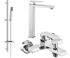 Technická data: Materiál umyvadlové baterie: mosaz Povrchová úprava: Chrome Hlava: Keramická Perlátor: Ano Výška: 293 mm Dosah výtoku: 160 mm Materiál vanové baterie: mosaz Povrchová úprava: Chrome Hlava: Keramická Perlátor: Ano Dosah výtoku: 168,3 mm Materiál hřídele: Nerezová ocel, ABS Povrchová úprava tyče: Chrome Výška: 800 mm Šířka lišty: 22 mm Vzdálenost od stěny: 105 mm Miska na mýdlo Posuvný držák na sluchátko Nastavitelné montážní držáky Materiál sluchátek: Plast Povrchová úprava sluchátek: Chrome Počet funkcí: 3 Výška sluchátek: 225 mm Šířka hlavy: 80 mm Materiál hadice: PVC Povrchová úprava hadice: Chrom Délka hadice: 150 cm Mosazné hroty Hladký povrch usnadňuje údržbu Otočné hroty zabraňují kroucení Pružný materiál odolný proti roztahování a ohýbání EAN: 5907709186385