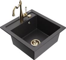 Technická data: dřez: Rozměr: 520 x 490 x 210 mm Hloubka komory: 200 mm Rozměry komory: 410x360 mm Průměr odtoku: ø90 mm Typ: 1-komorový Typ: Zapuštěné do pracovní desky Barva: Skvrnitá černá Povrchová úprava sifonu: zlatá Materiál: žula (80 % žulové kamenivo, 20 % pryskyřice) Přepadový otvor: Ano Otvory: (baterie, automatické) 2 Vysoká odolnost proti poškrábání a změně barvy Odolnost proti tepelným šokům Snadno čistitelný povrch Jeden dodatečný vyfrézovaný otvor pro samoděrování ø35 kuchyňská baterie: Materiál: mosaz Barva: Zlatá Hlava: Keramická Provzdušňovač: Ano Typ: Jedna páka Výška baterie: 290 mm Rozsah výtoku: 260 mm EAN: 5905315038258