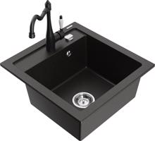Technická data: dřez: Rozměr: 520 x 490 x 210 mm Hloubka komory: 200 mm Rozměry komory: 410x360 mm Průměr odtoku: ø90 mm Typ: 1-komorový Typ: Zapuštěné do pracovní desky Barva: černá/zlatá metalíza Povrchová úprava sifonu: Chrome Materiál: žula (80 % žulové kamenivo, 20 % pryskyřice) Přepadový otvor: Ano Otvory: (baterie, automatické) 2 Vysoká odolnost proti poškrábání a změně barvy Odolnost proti tepelným šokům Snadno čistitelný povrch Jeden dodatečný vyfrézovaný otvor pro samoděrování ø35 kuchyňská baterie: Materiál: mosaz Černá barva Hlava: Keramická Provzdušňovač: Ano Typ: Jedna páka Výška baterie: 290 mm Rozsah výtoku: 260 mm EAN: 5905315038234