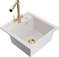 Technická data: dřez: Rozměr: 520 x 490 x 210 mm Hloubka komory: 200 mm Rozměry komory: 410x360 mm Průměr odtoku: ø90 mm Typ: 1-komorový Typ: Zapuštěné do pracovní desky bílá barva Povrchová úprava sifonu: zlatá Materiál: žula (80 % žulové kamenivo, 20 % pryskyřice) Přepadový otvor: Ano Otvory: (baterie, automatické) 2 Vysoká odolnost proti poškrábání a změně barvy Odolnost proti tepelným šokům Snadno čistitelný povrch Jeden dodatečný vyfrézovaný otvor pro samoděrování ø35 kuchyňská baterie: Materiál: mosaz Barva: Zlatá Hlava: Keramická Provzdušňovač: Ano Typ: Dvě rukojeti Rozsah výtoku: 235 mm Výška baterie: 315 mm Dvouhlavá baterie s přídavným kanálem pro filtrovanou pitnou vodu EAN: 5905315022677