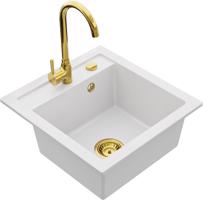 Technická data: dřez: Rozměr: 520 x 490 x 210 mm Hloubka komory: 200 mm Rozměry komory: 410x360 mm Průměr odtoku: ø90 mm Typ: 1-komorový Typ: Zapuštěné do pracovní desky bílá barva Povrchová úprava sifonu: zlatá Materiál: žula (80 % žulové kamenivo, 20 % pryskyřice) Přepadový otvor: Ano Otvory: (baterie, automatické) 2 Vysoká odolnost proti poškrábání a změně barvy Odolnost proti tepelným šokům Snadno čistitelný povrch Jeden dodatečný vyfrézovaný otvor pro samoděrování ø35 kuchyňská baterie: Materiál: mosaz Barva: Zlatá Hlava: Keramická Provzdušňovač: Ano Výška baterie: 335 mm Rozsah výtoku: 180 mm EAN: 5907709189270