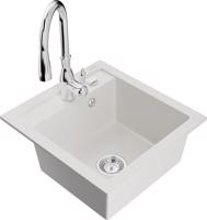 dřez: Rozměr: 520 x 490 x 210 mm Hloubka komory: 200 mm Rozměry komory: 410x360 mm Průměr odtoku: ø90 mm Typ: 1-komorový Typ: Zapuštěné do pracovní desky bílá barva Povrchová úprava sifonu: Chrome Materiál: žula (80 % žulové kamenivo, 20 % pryskyřice) Přepadový otvor: Ano Otvory: (baterie, automatické) 2 Vysoká odolnost proti poškrábání a změně barvy Odolnost proti tepelným šokům Snadno čistitelný povrch Jeden dodatečný vyfrézovaný otvor pro samoděrování ø35 kuchyňská baterie: Materiál: mosaz Barva: Chrome Hlava: Keramická Provzdušňovač: Ano Typ: Jedna páka Výška baterie: 410 mm Rozsah výtoku: 231 mm EAN: 5905315032904