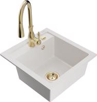dřez: Rozměr: 520 x 490 x 210 mm Hloubka komory: 200 mm Rozměry komory: 410x360 mm Průměr odtoku: ø90 mm Typ: 1-komorový Typ: Zapuštěné do pracovní desky bílá barva Povrchová úprava sifonu: zlatá Materiál: žula (80 % žulové kamenivo, 20 % pryskyřice) Přepadový otvor: Ano Otvory: (baterie, automatické) 2 Vysoká odolnost proti poškrábání a změně barvy Odolnost proti tepelným šokům Snadno čistitelný povrch Jeden dodatečný vyfrézovaný otvor pro samoděrování ø35 kuchyňská baterie: Materiál: mosaz Barva: Zlatá Hlava: Keramická Provzdušňovač: Ano Typ: Jedna páka Výška baterie: 410 mm Rozsah výtoku: 231 mm EAN: 5905315032928