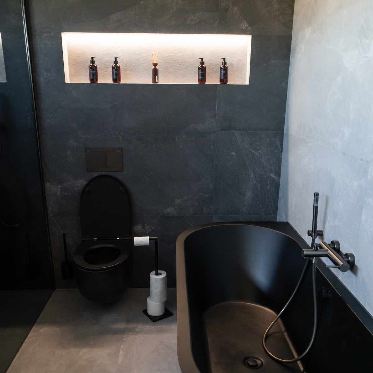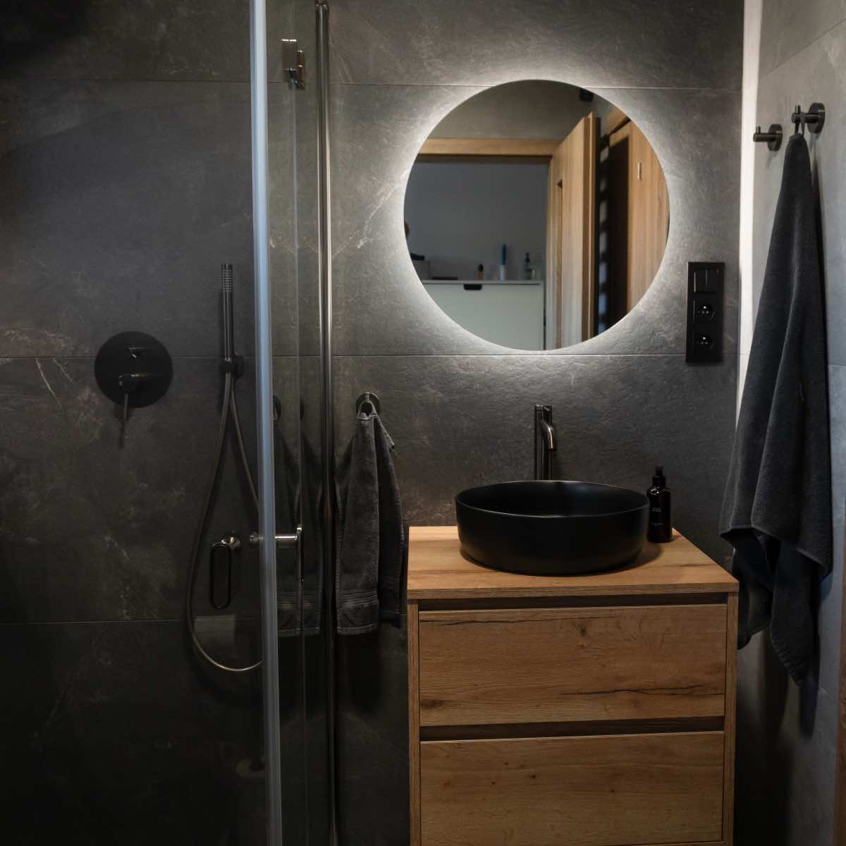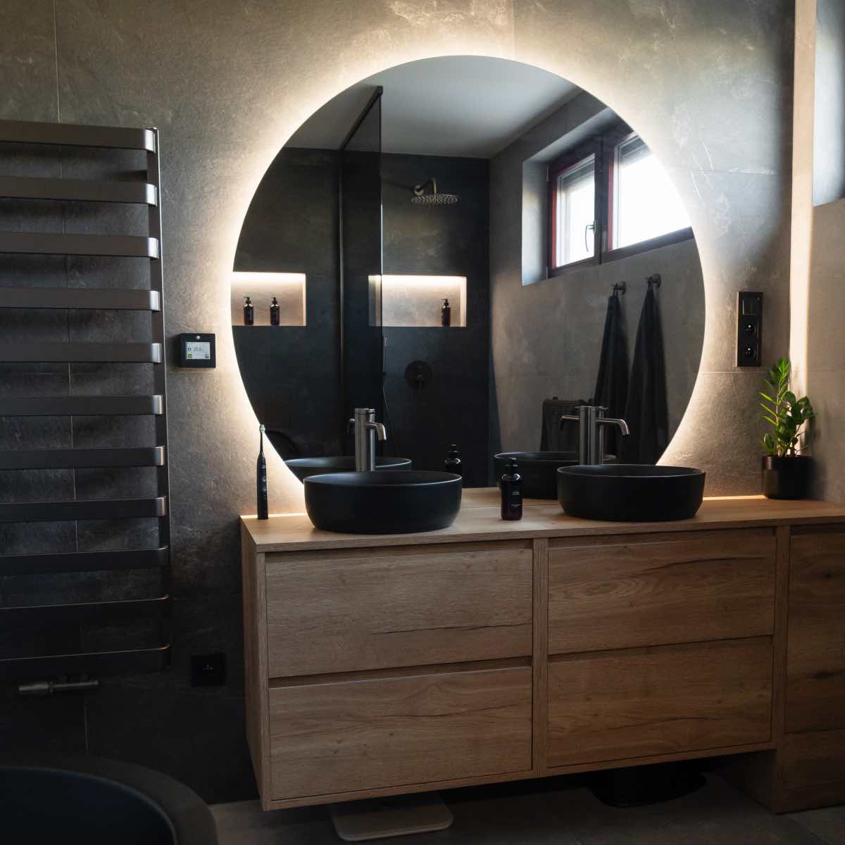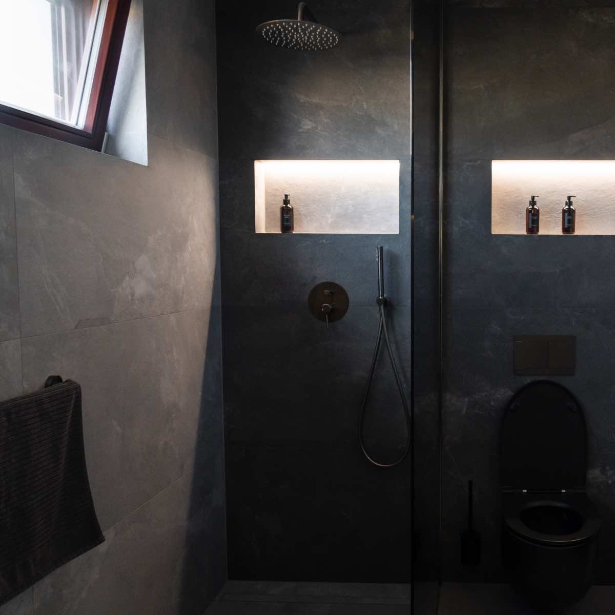 Při této realizaci u klientů v Praze byly vytvořeny dokonce dvě krásné koupelny v tmavých tónech. Všechna sanitární zařízení, od umyvadel až po vanu, jsou v černé barvě, což dodává moderní a kompaktní vzhled.