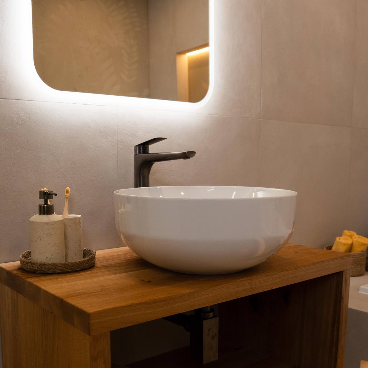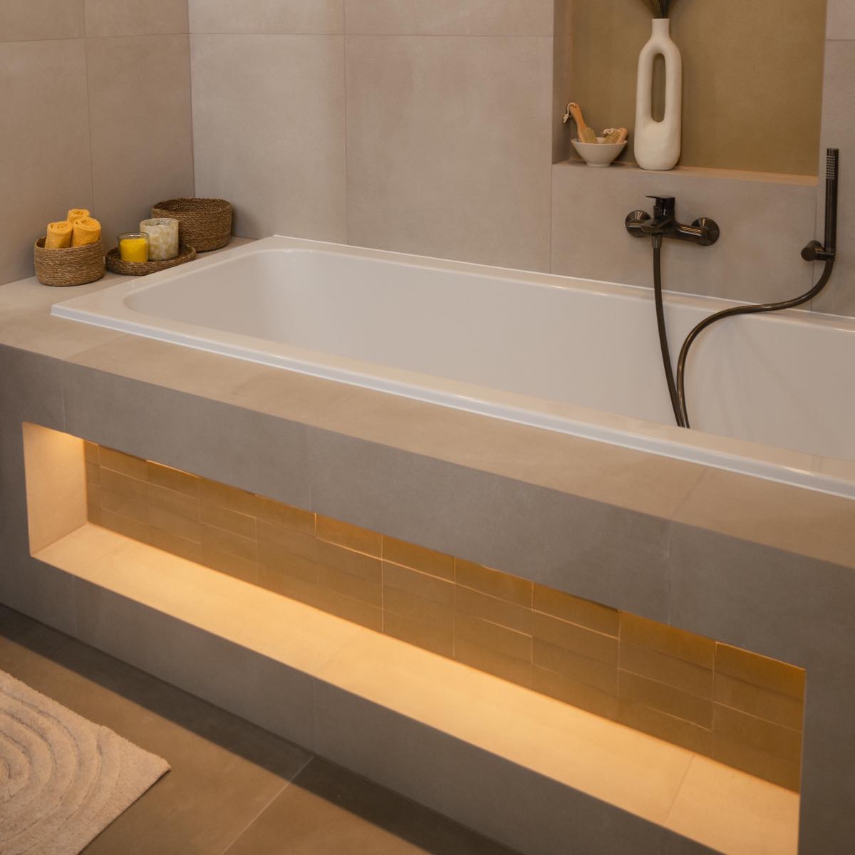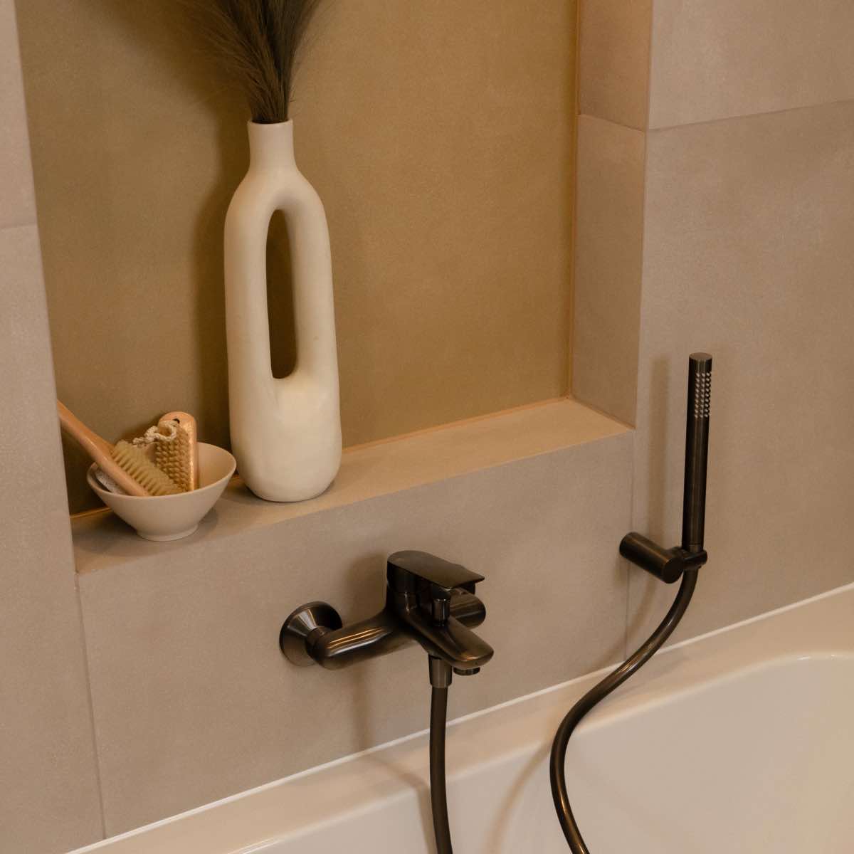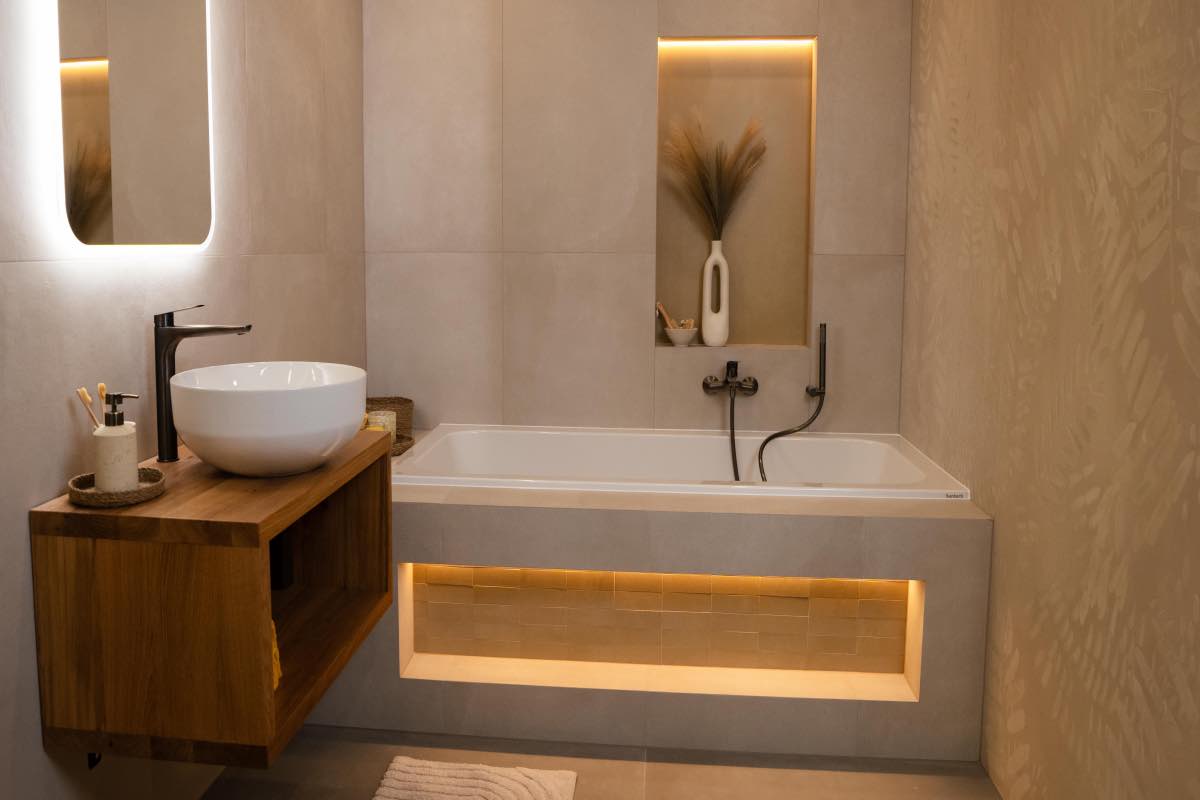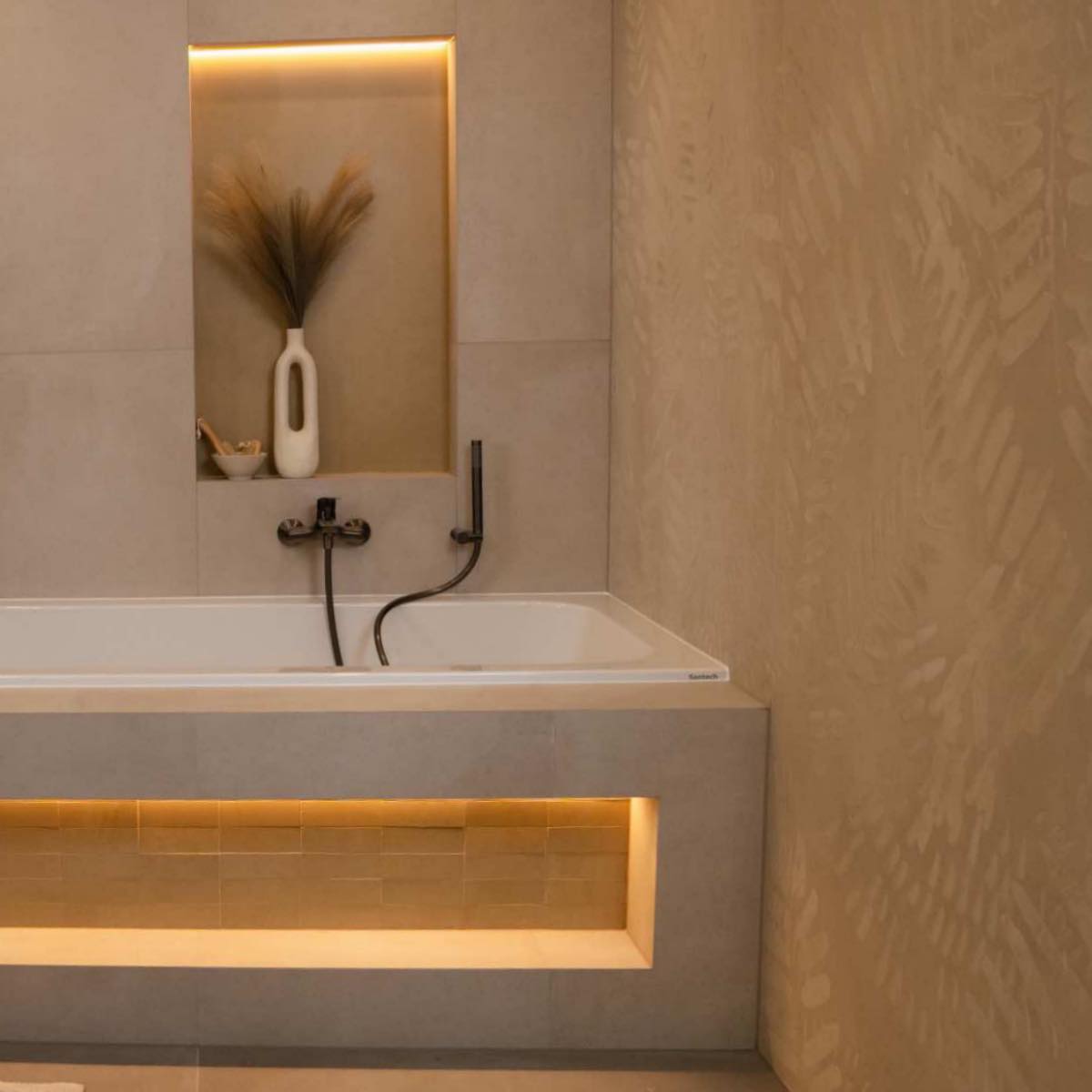 Představujeme vám CAORLE V. Wellness koupelnu v jemných pískových tónech.
