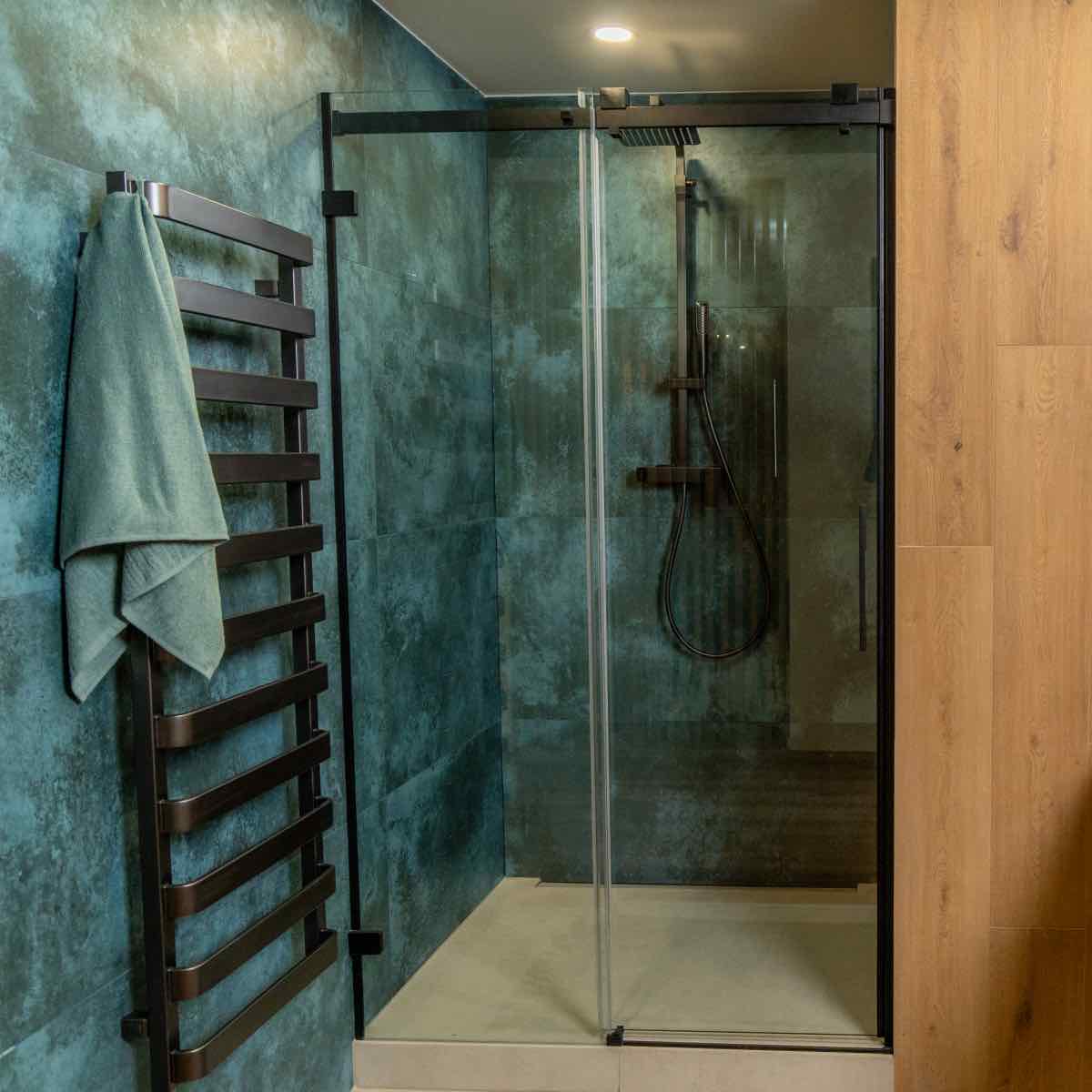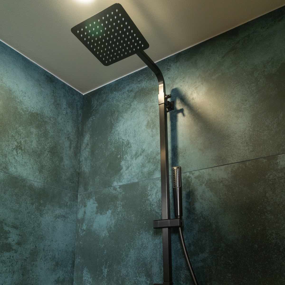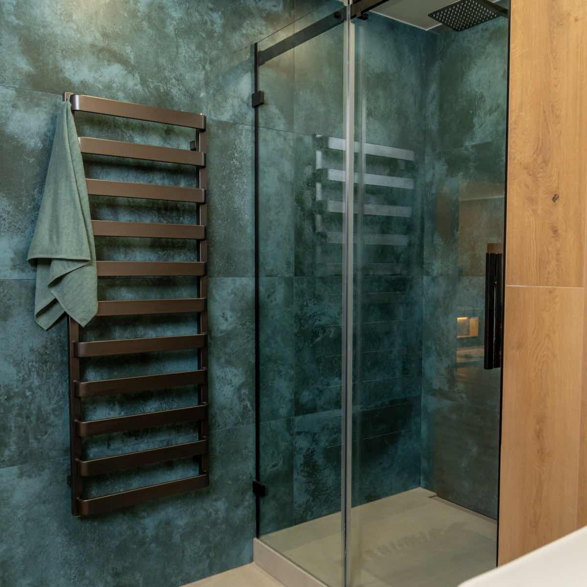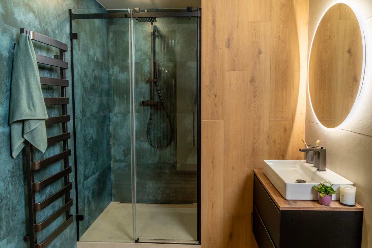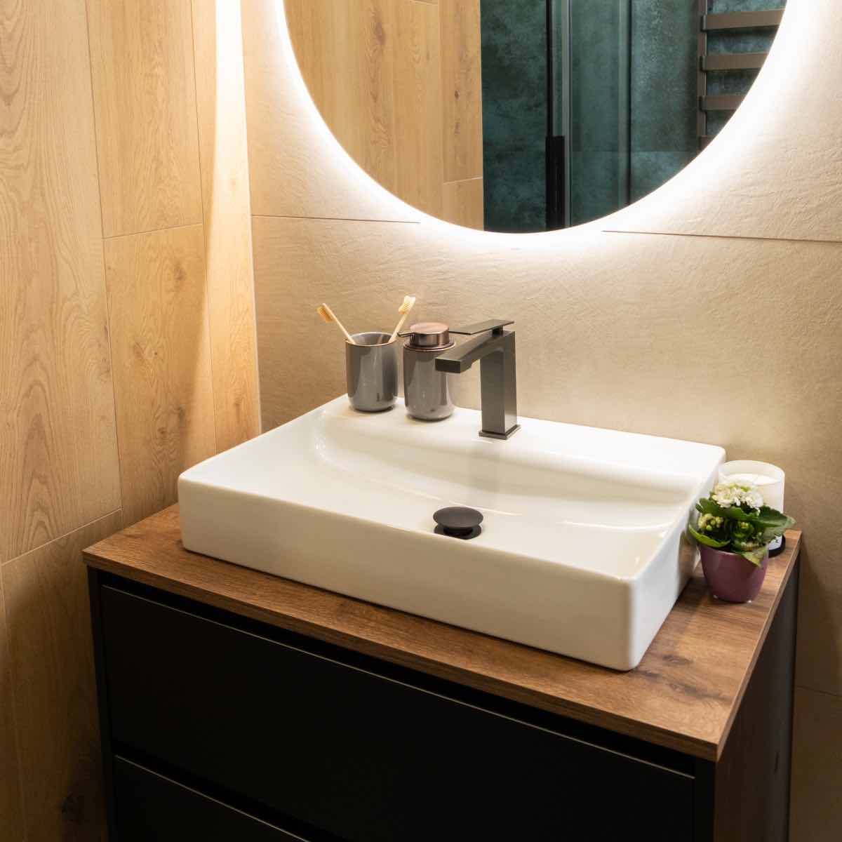 Koupelna Marinella IV spojuje přírodní dřevo, tmavé detaily a jemné modrozelené akcenty.
