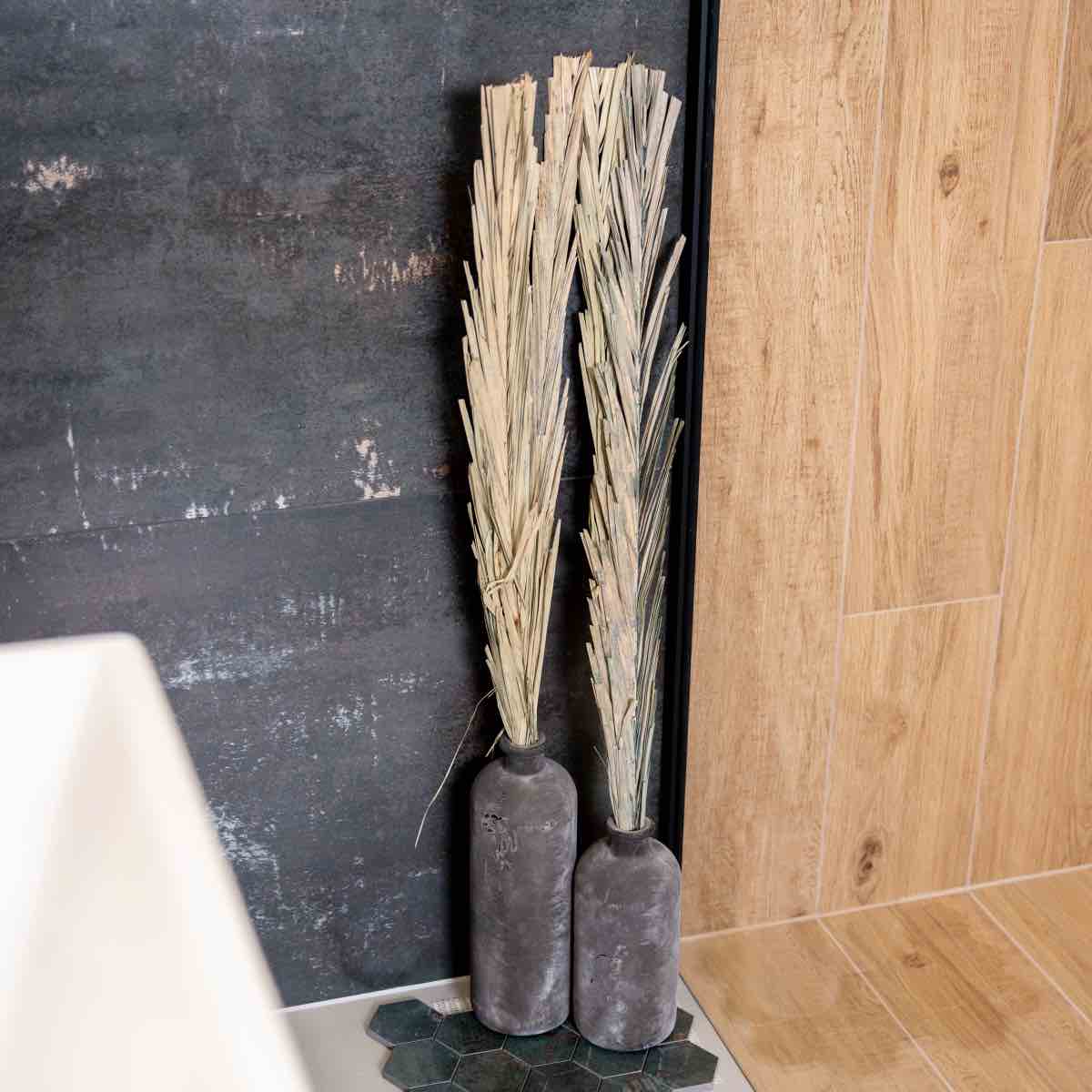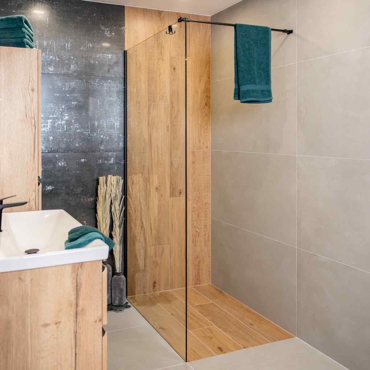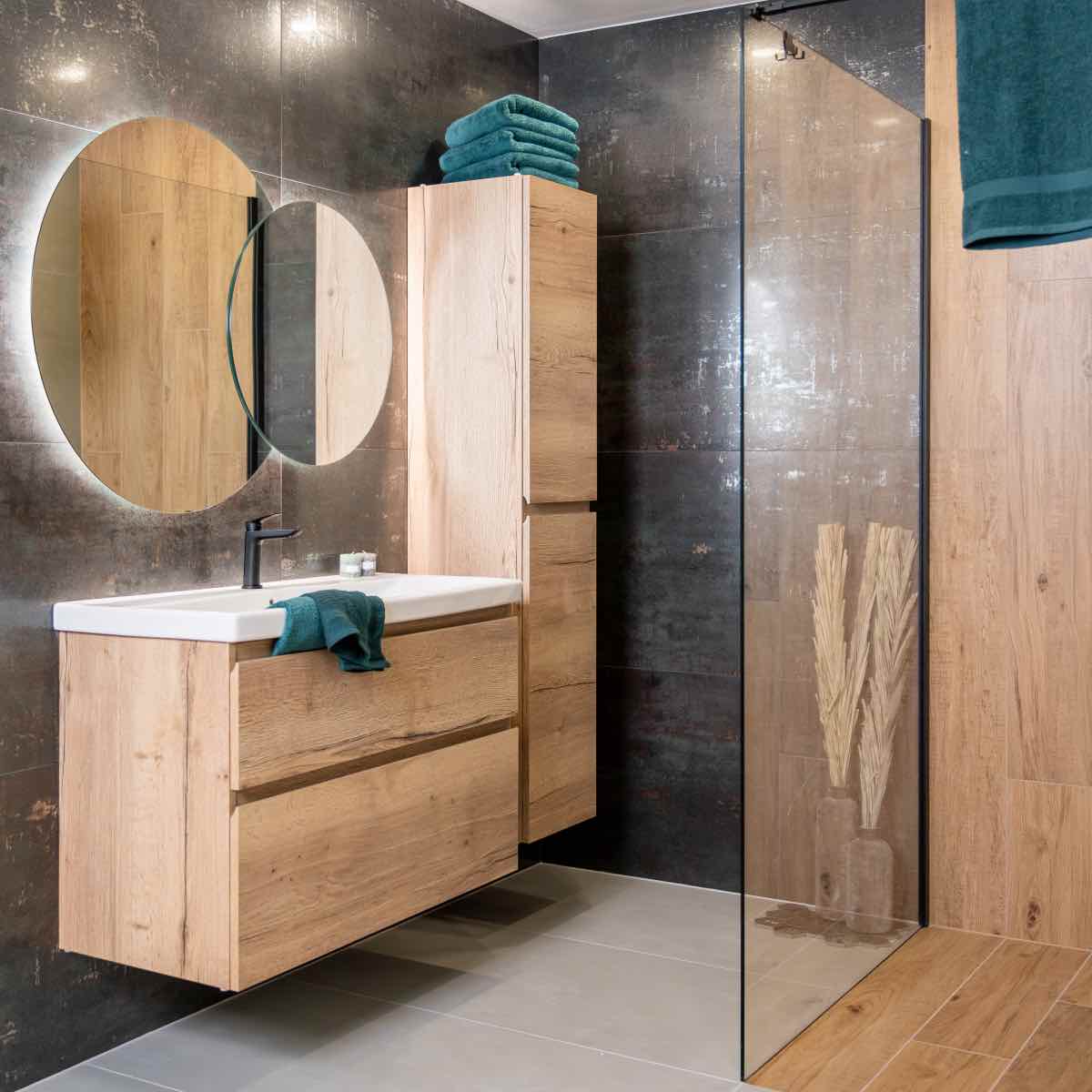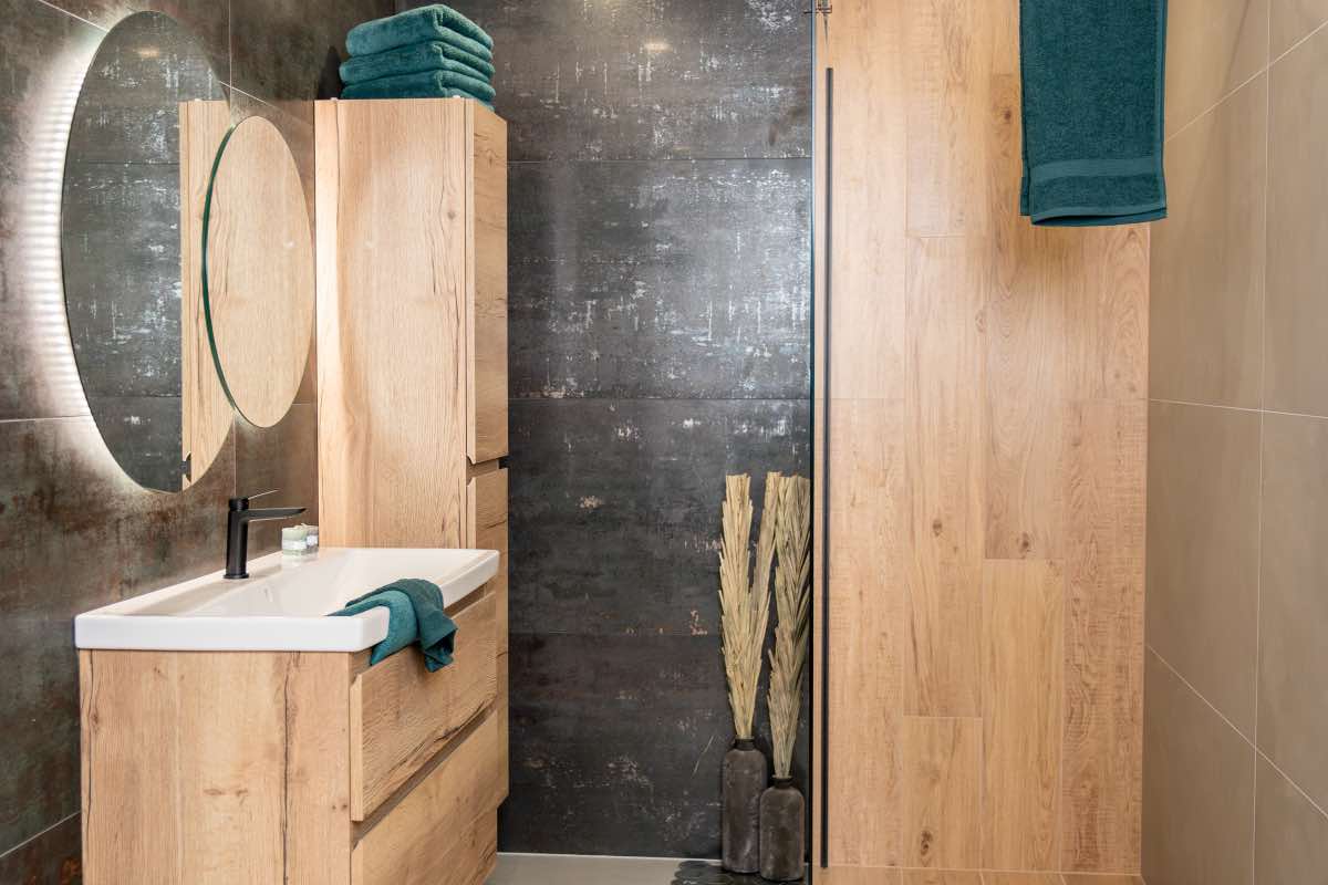 Koupelna MEDIN SEAGREEN vyniká spojením tmavě zelených obkladů a dřeva. I přes zvolené tmavé barvy působí harmonicky.
