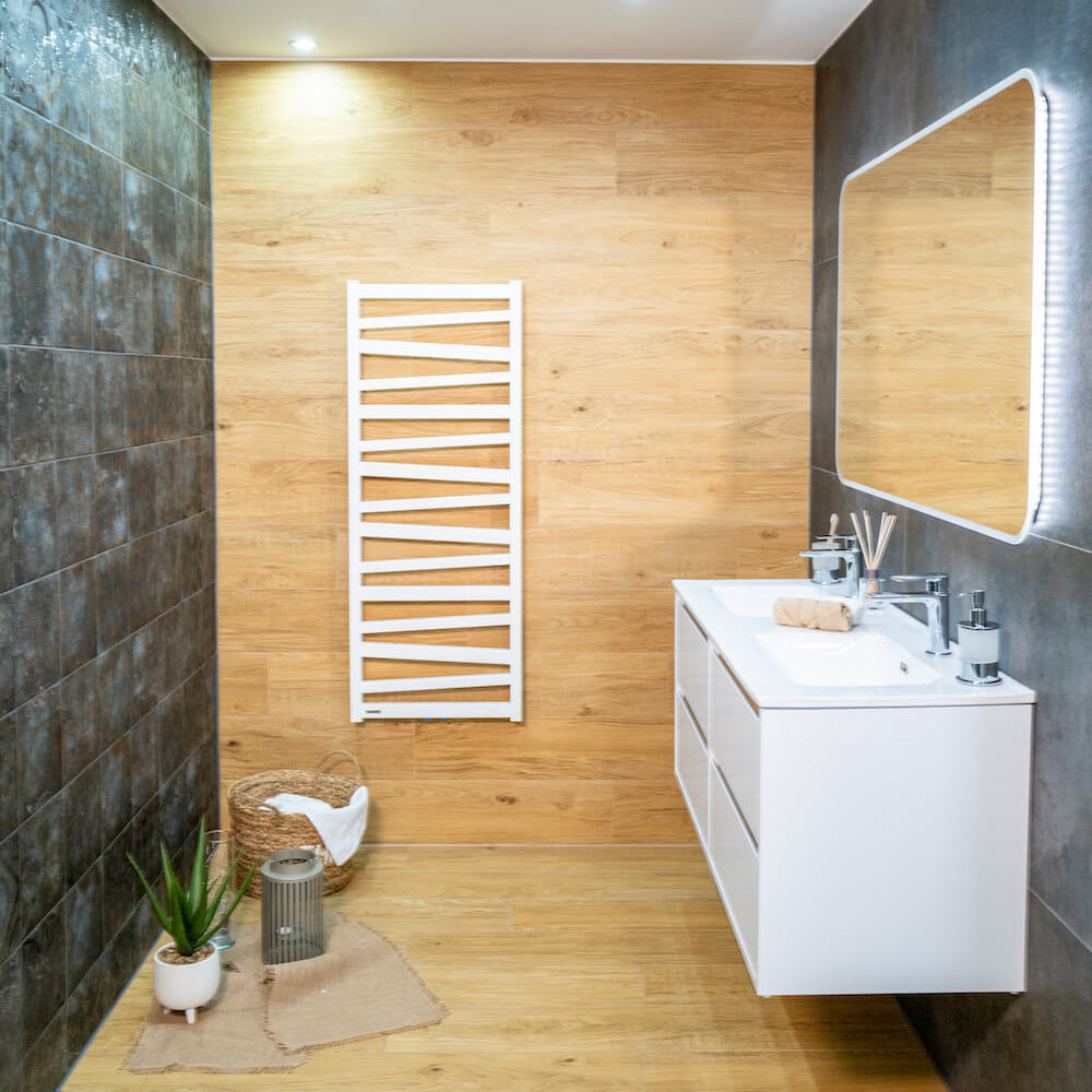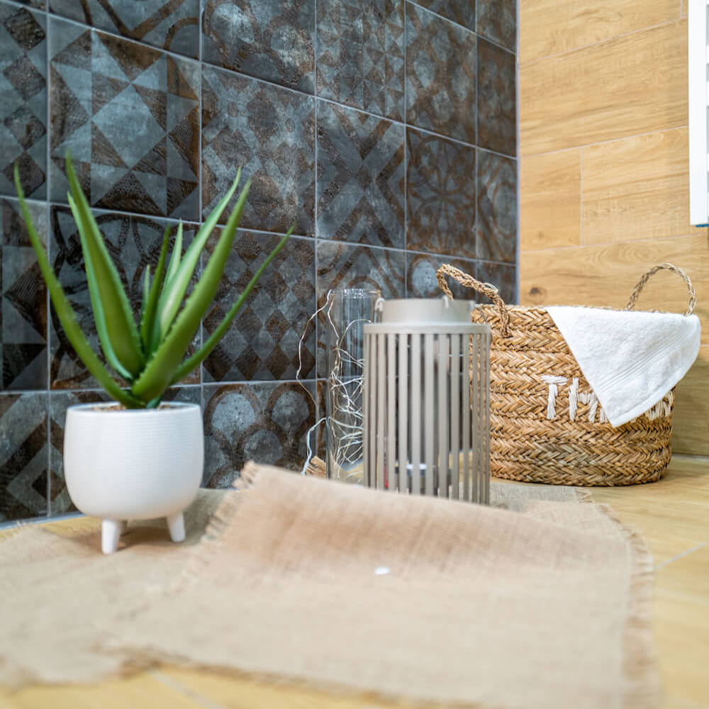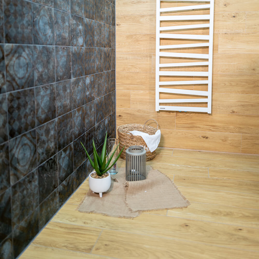 TENORIO působí díky kombinaci dřevěného dekoru a tmavě šedých designových obkladů příjemně hřejivým dojmem.