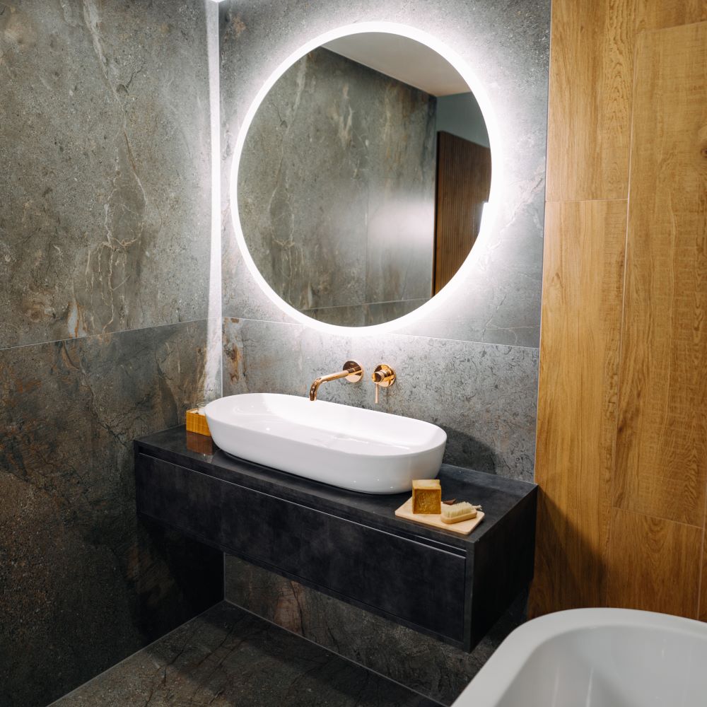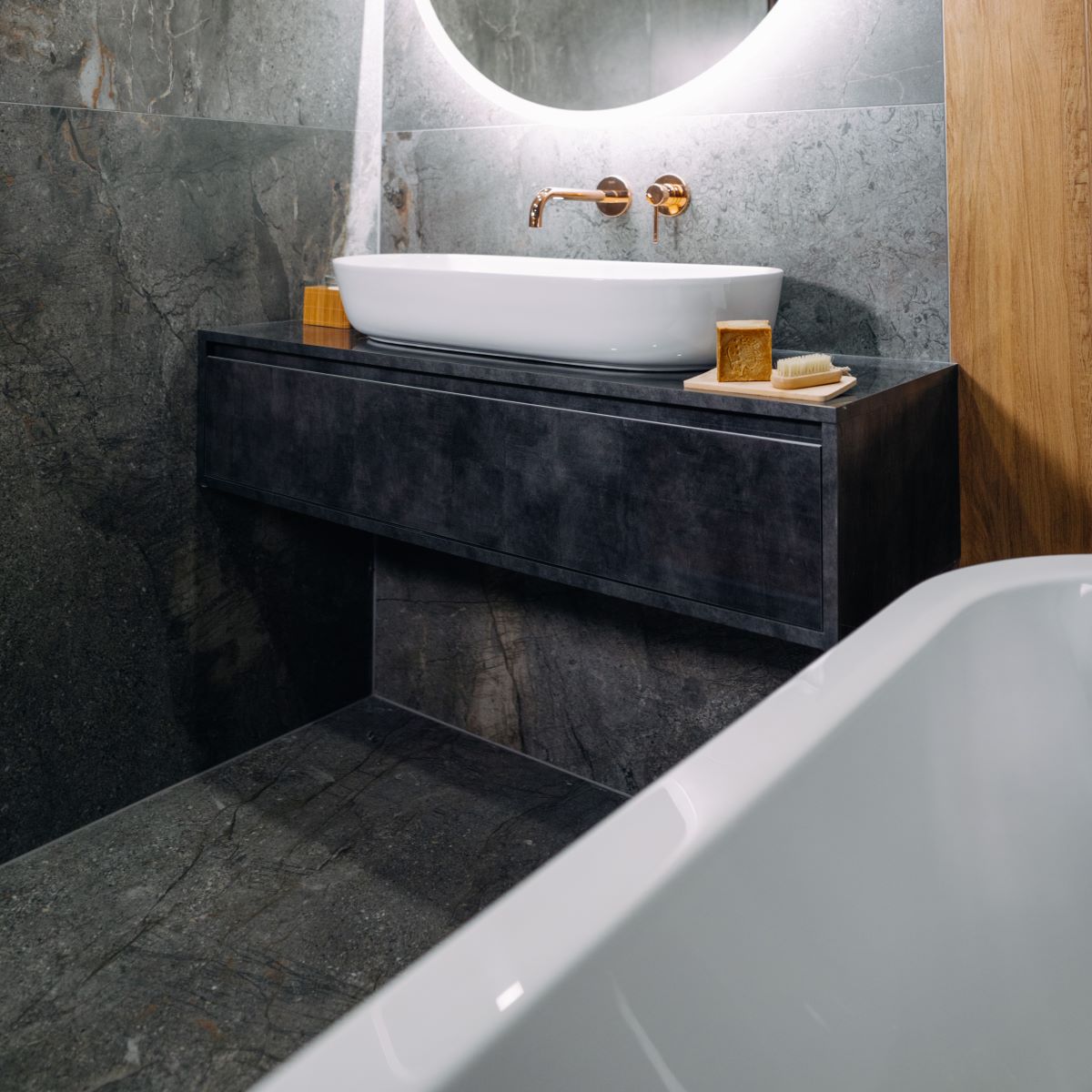 Z koupelny TEO II na vás dýchne přírodní, a přitom elegantní dojem.