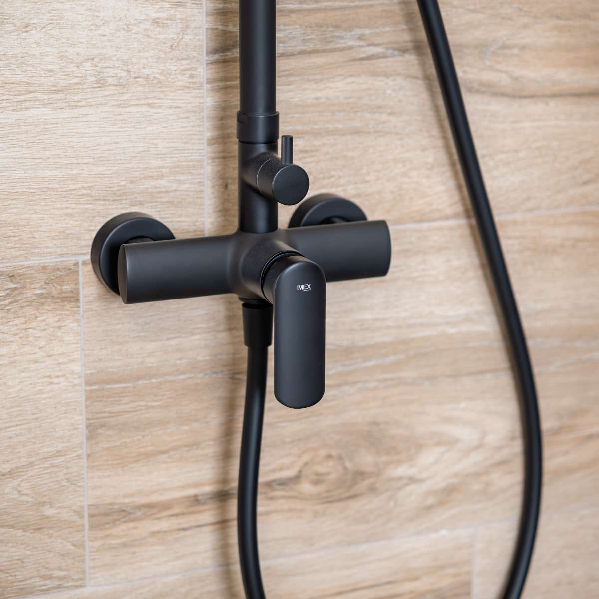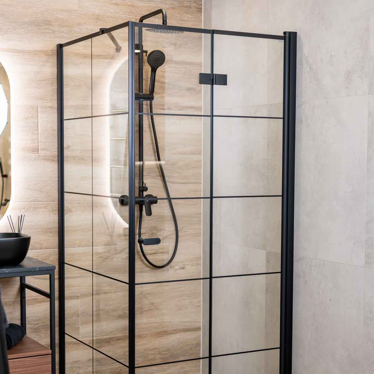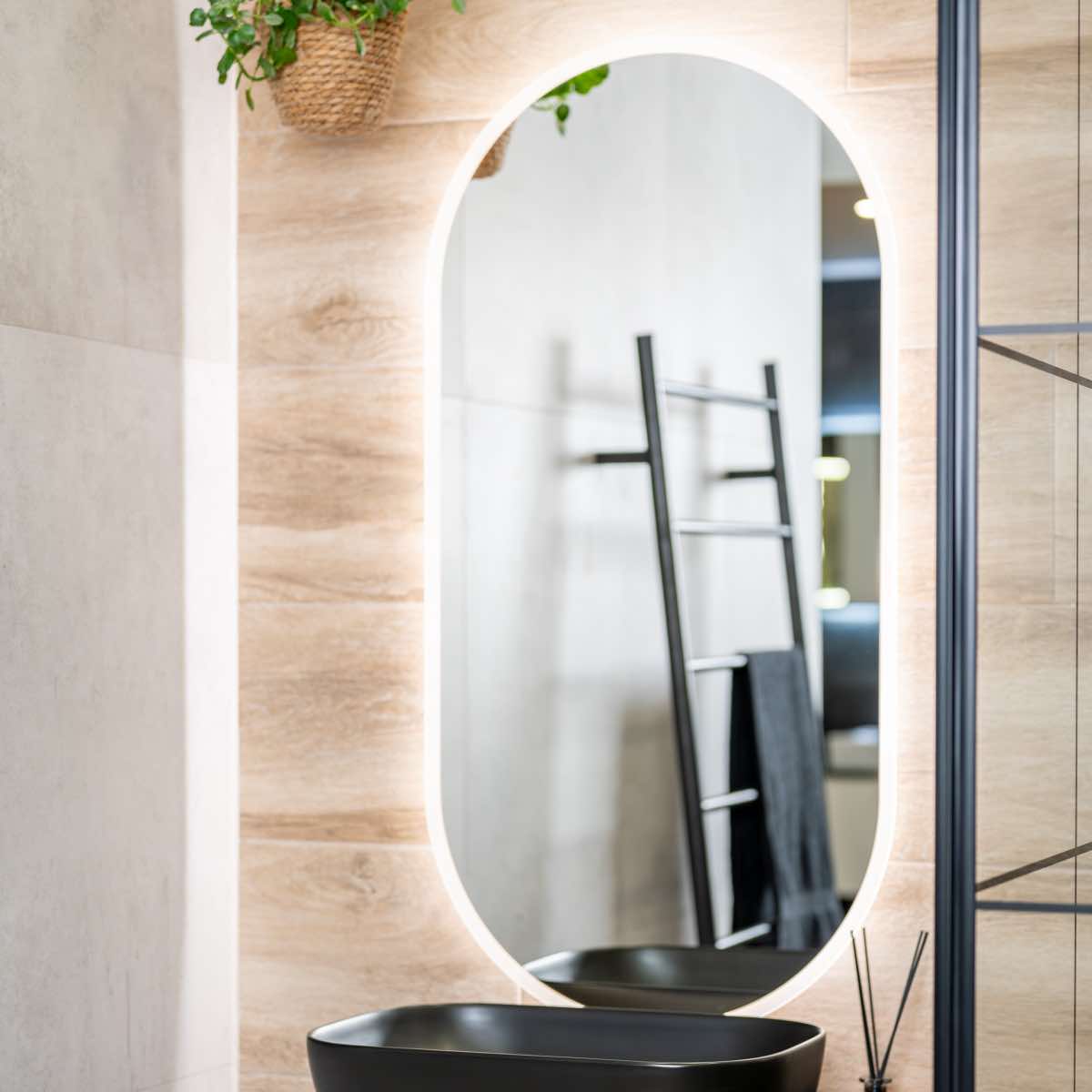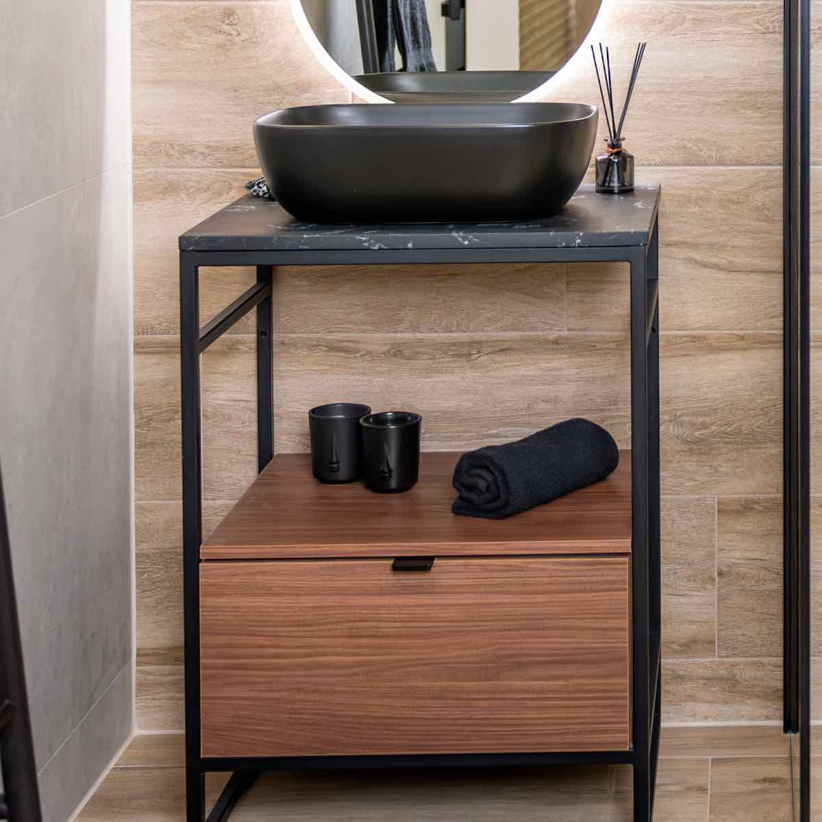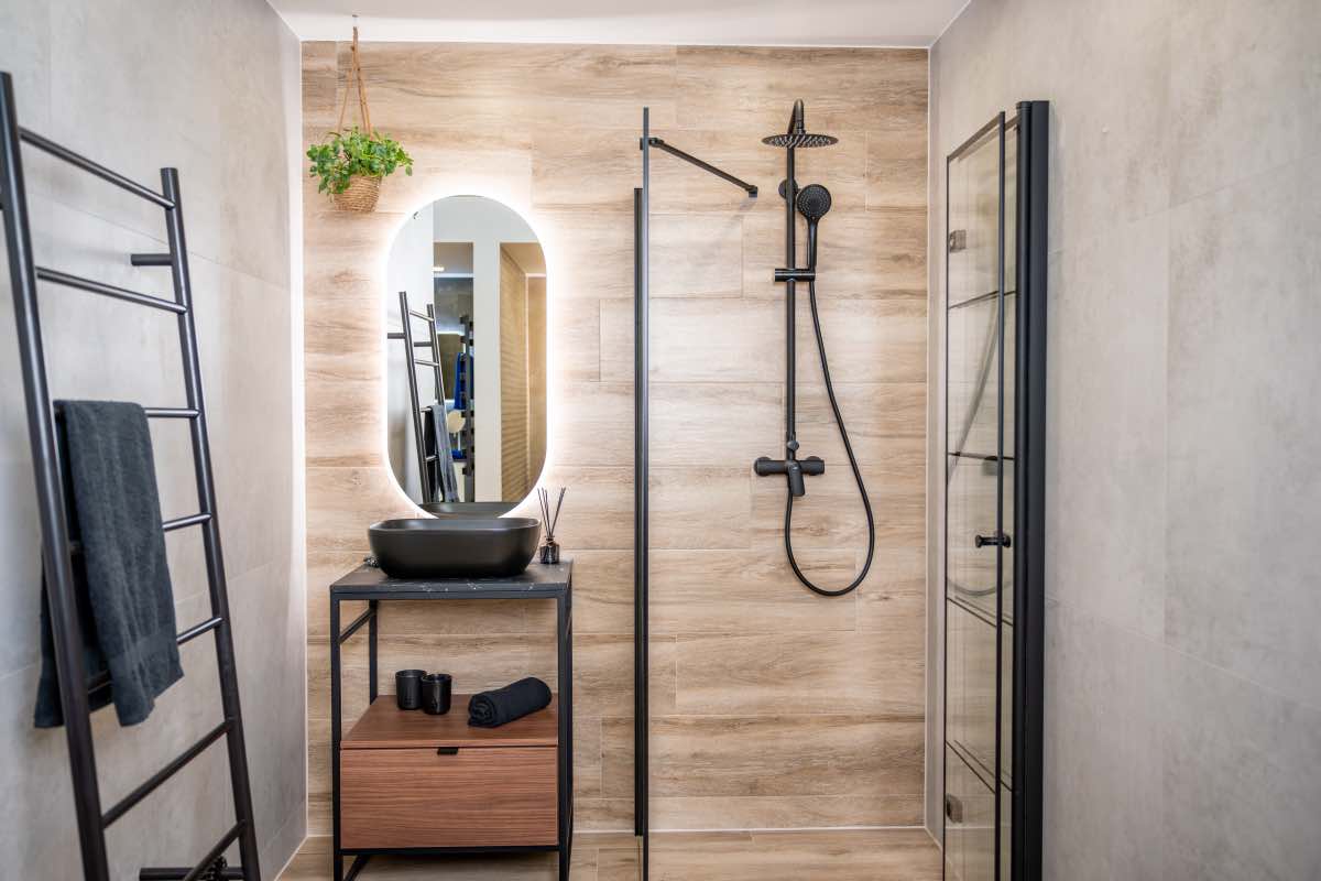 Imitace dřeva, betonu a k tomu černé doplňky. Neobvyklá kombinace funguje v koupelně TREOS skvěle.