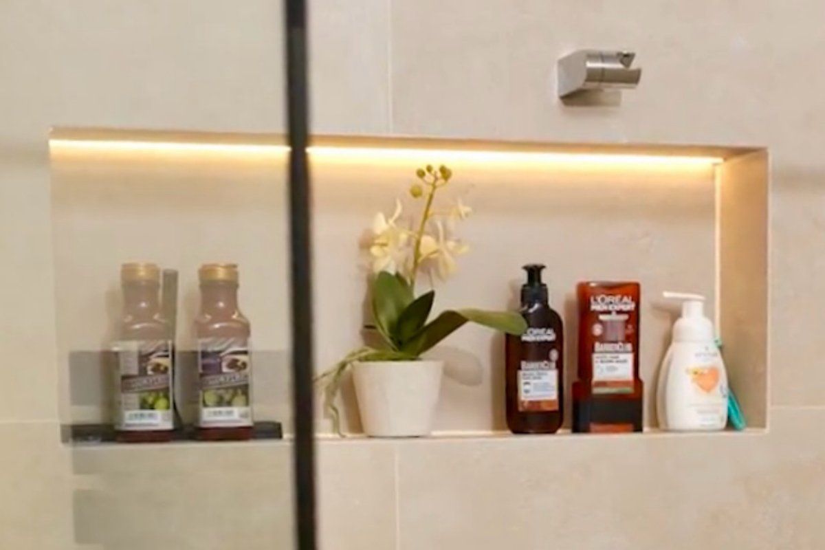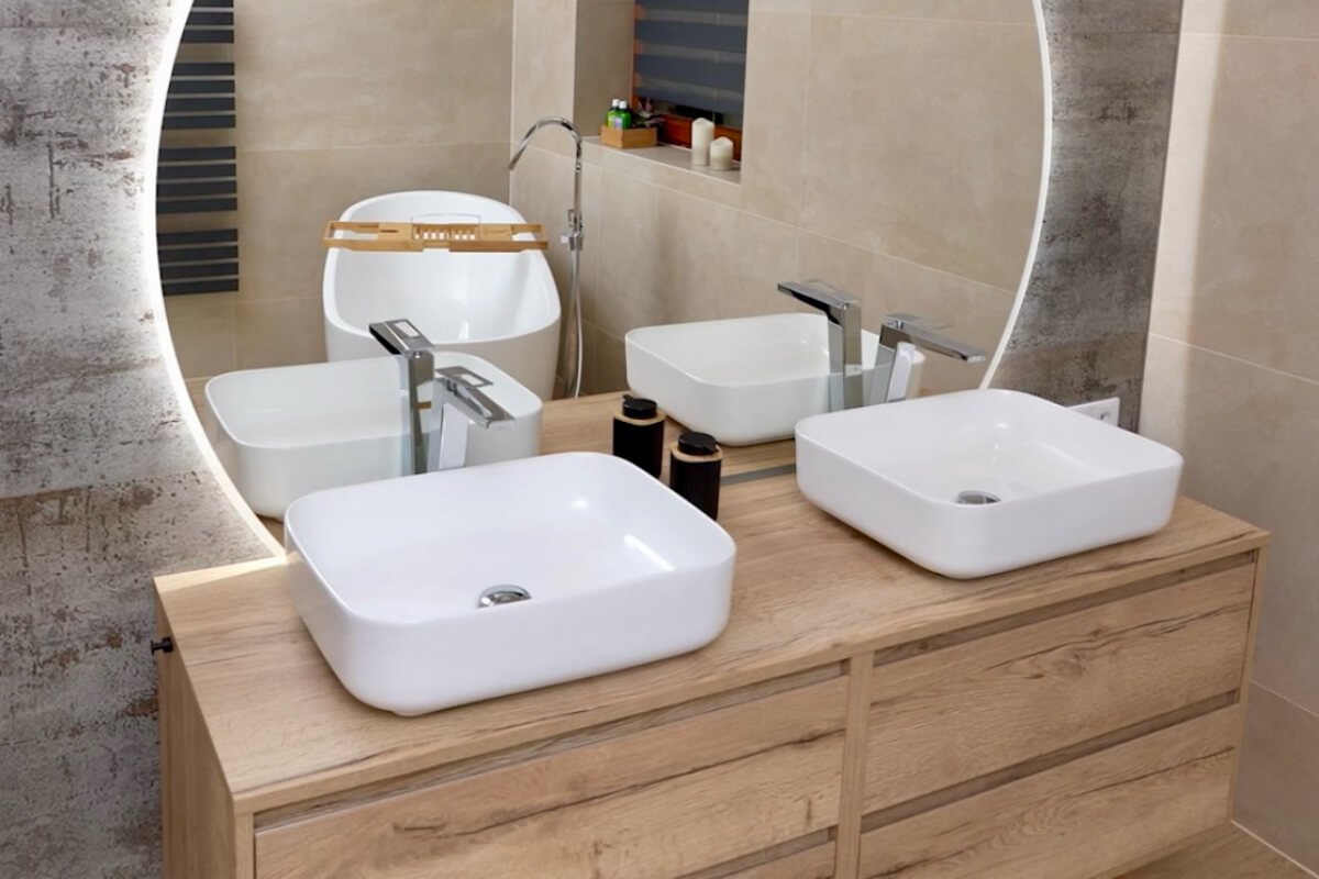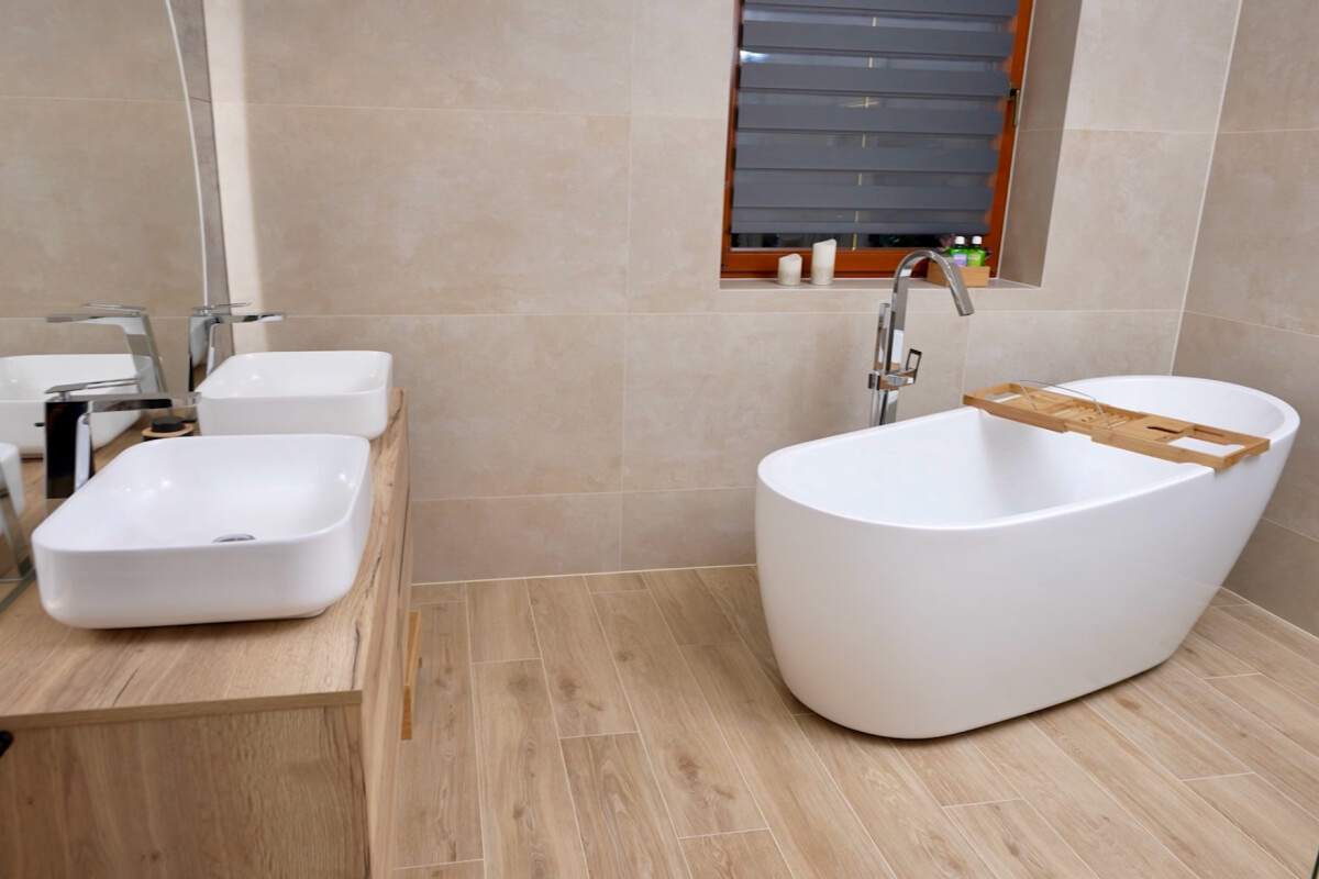 Těžko říct, co je hlavní dominantou této koupelny. Jestli je to designová volně stojící vana, velkoformátové zrcadlo na míru nebo dvě umyvadla na skříňce v dekoru Dub Halifax. Z výsledku jsme každopádně nadšeni. O hřejivou atmosféru se stará béžový obklad v kombinaci s metalickou šedou a imitací dřeva, ale i designová svítidla.